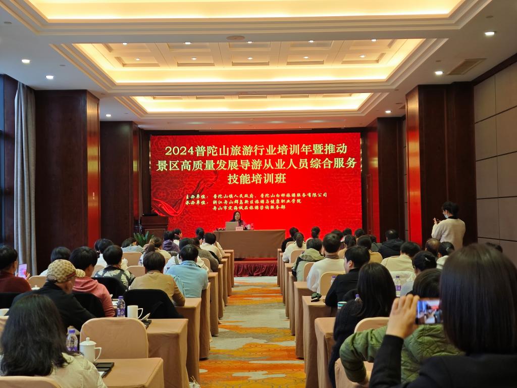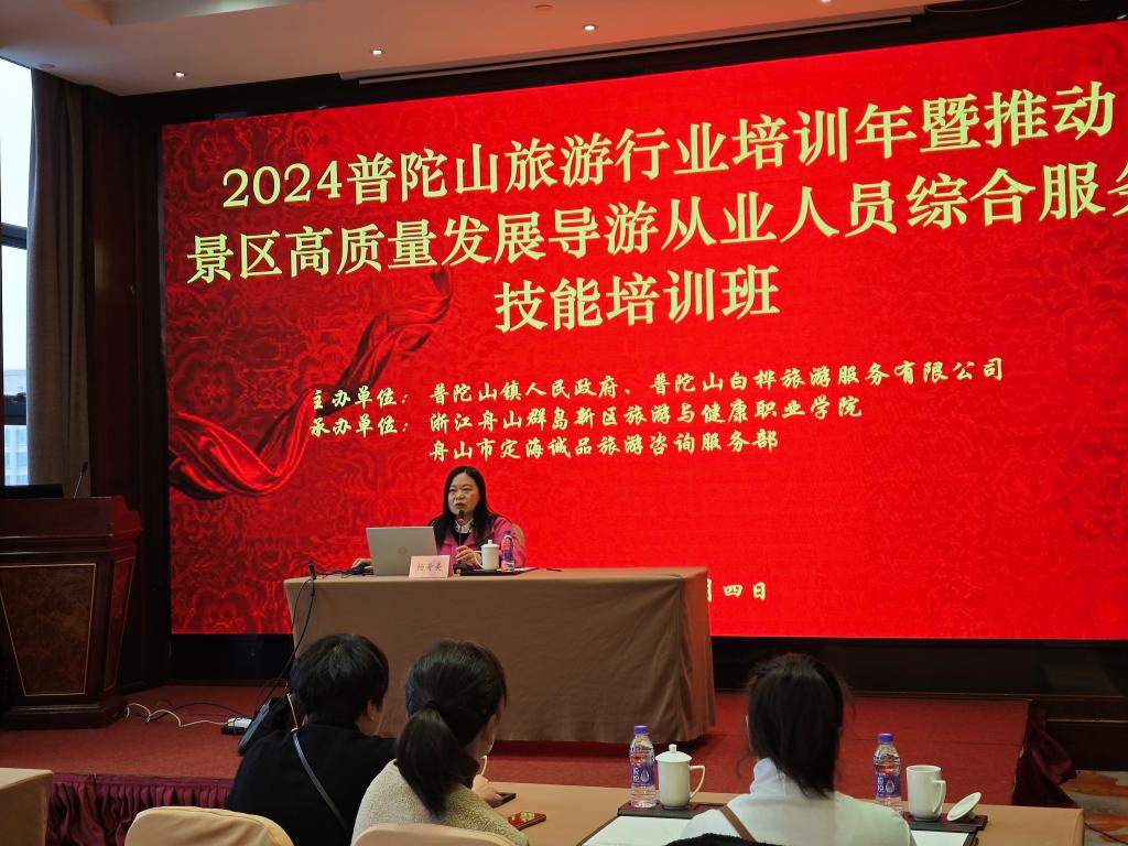为进一步提升普陀山籍导游人员队伍的专业能力,提高导游服务质量,由普陀山镇人民政府、普陀山白桦旅游服务有限公司主办,浙江舟山群岛新区旅游与健康职业学院和浙江舟山联纵广告传媒有限公司承办的2024普陀山旅游行业培训年暨推动景区高质量发展导游从业人员综合服务技能培训班于2023年12月4日-7日在东港元生大酒店顺利开班。此次培训班为期4天,共有220位导游从业人员参加,邀请了我校旅游学院院长杨奇美和副院长黄刚进行授课,采取讲学练结合的培训方式,培训内容包含政策法规、导游专业知识、导游服务能力提升、现场指导等课程内容。