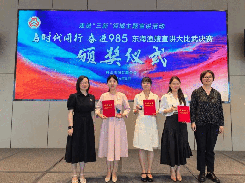 为深入学习贯彻习近平新时代中国特色社会主义思想,进一步凝聚广大妇女群众听党话跟党走的强大意识,助力高水平建设现代海洋城市建设,8月15日下午,由舟山市妇联举办的“与时代同行 奋进985”东海渔嫂宣讲大比武在朱家尖舟山海景皇冠假日酒店落下帷幕,巾帼宣讲员们同台竞技、激情宣讲,展现了良好的精神风貌和业务素养。我校健康学院辅导员苗莉欣老师代表校妇联参赛荣获三等奖佳绩。