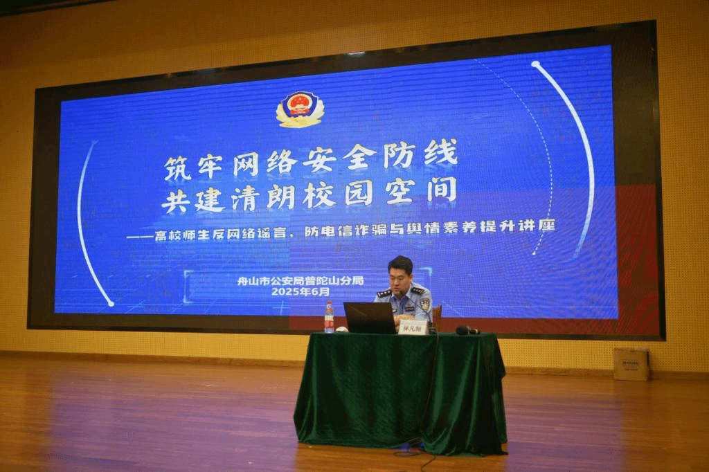 为深入贯彻党的二十大精神,强化校园意识形态阵地建设,提升师生网络安全与反诈防骗能力,6月18日下午,我校与舟山市公安局普陀山分局共同举办“意识形态”专题讲座,邀请普陀山分局网安大队教导员林凡翔警官作《筑牢网络安全防线 共建清朗校园空间》意识形态专题报告。在校党政班子成员、师生代表共400余人参加了讲座。