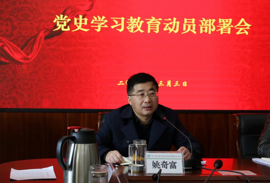 会上,姚奇富书记传达省、市党史学习教育动员部署会精神,并结合我校实际工作,提出学习教育的几点意见:一、提高站位,统一思想,充分认识开展党史学习教育的重要性。一是开展党史学习教育,是一场唤醒红色基因、坚定理想信念的精神磨砺;二是开展党史学习教育,是一场思想洗礼、强化“为人民服务”的宗旨意识;三是开展党史学习教育,是一场回炉再造、提升战斗力炼就铁肩膀的务实之行;开展党史学习教育,是一场自我革命、永葆清正廉洁政治本色的担当之举。二、明确方向,突出重点,切实加强开展党史学习教育的针对性。一是聚焦“明理”,就是要明白一个道理;二是聚焦“增信”,就是要增强信仰和信念;三是聚焦“崇德”,就是要加强党性修养;四是聚焦“力行”,就是要学以致用。三、加强领导,狠抓落实,努力提高开展党史学习教育的有效性。一要从党史学习教育中汲取智慧力量;二要从党史学习教育中汲取智慧力量;三要从党史学习教育中汲取智慧力量;四要从党史学习教育中汲取智慧力量;五要从党史学习教育中汲取智慧力量。四、加强组织领导与学习提高实效。一要加强督促指导,层层压实主体责任;二要注重方式方法创新。