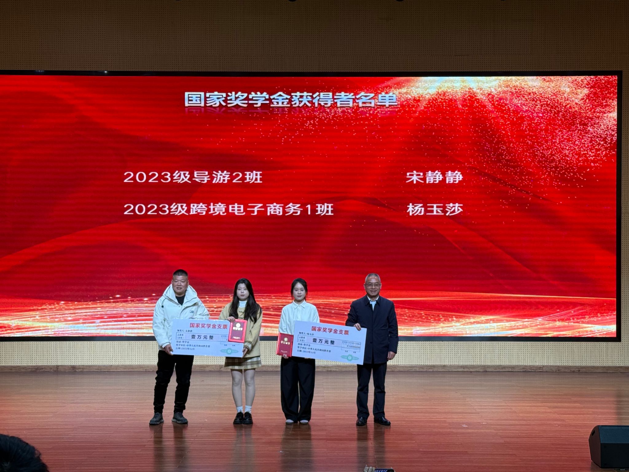 副校长孔志华宣读表彰决定。与会领导和嘉宾依次为获奖代表颁奖。本次共表彰优秀班级7个,各类先进个人981人。24级导游1班陈思滢同学和23级跨境电子商务1班杨玉莎同学,分别代表先进班级和先进个人上台发言。国家奖学金获得者宋静静同学的家长也受邀上台发言,将整场表彰盛典的情感氛围推向了高潮。