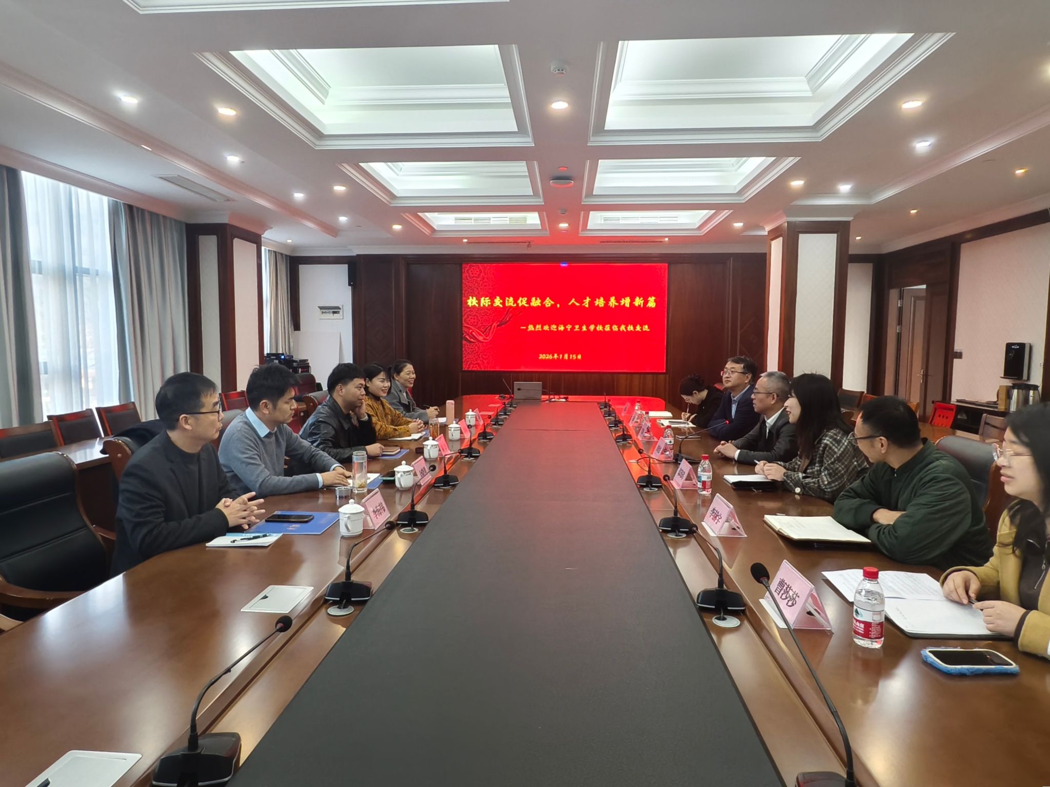 2026年1月15日,海宁卫生学校校长陈杰、副校长沈孝丽一行5人来访我校,共叙合作,同探育人。校长郑能波会见并座谈交流。此次交流,既是两校情谊的延续,更是携手响应国家现代职业教育体系建设号召、共育卫生健康领域高素质技能人才的重要步履。