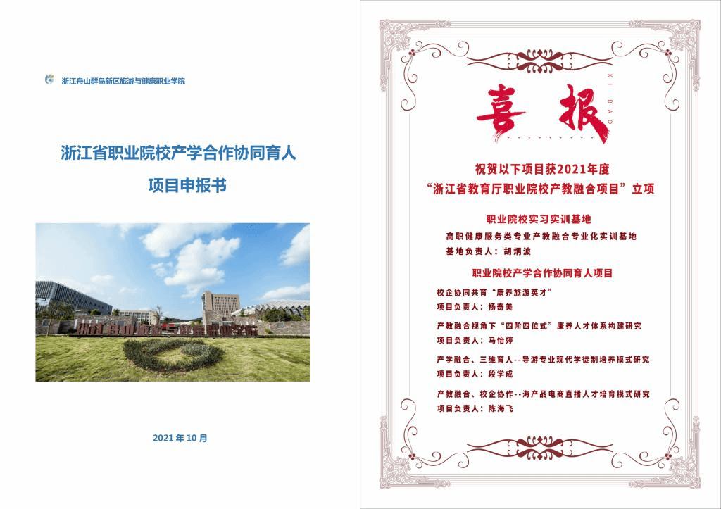 2021年12月20日,省教育厅发布《浙江省教育厅办公室关于公布2021年度职业院校产教融合项目遴选认定结果的通知》(浙教办职成〔2021〕60号),我校申报的“一基地、四项目”获批,其中“高职健康服务类专业产教融合专业化实训基地”获职业院校实习实训基地立项,“校企协同共育康养旅游英才”、“产教融合视角下'四阶四位式'康养人才体系构建研究”、“产学融合、三维育人——导游专业现代学徒制培养模式研究和产教融合”、“校企协作——海产品电商直播人才培育模式研究”四个项目获批产学协同育人项目立项。