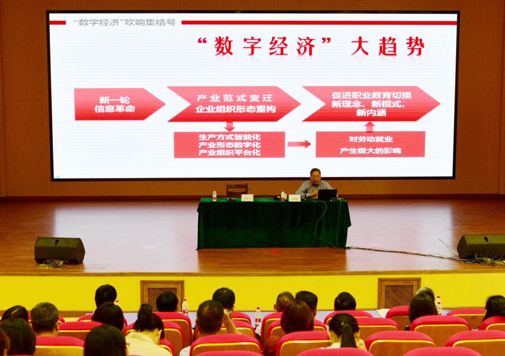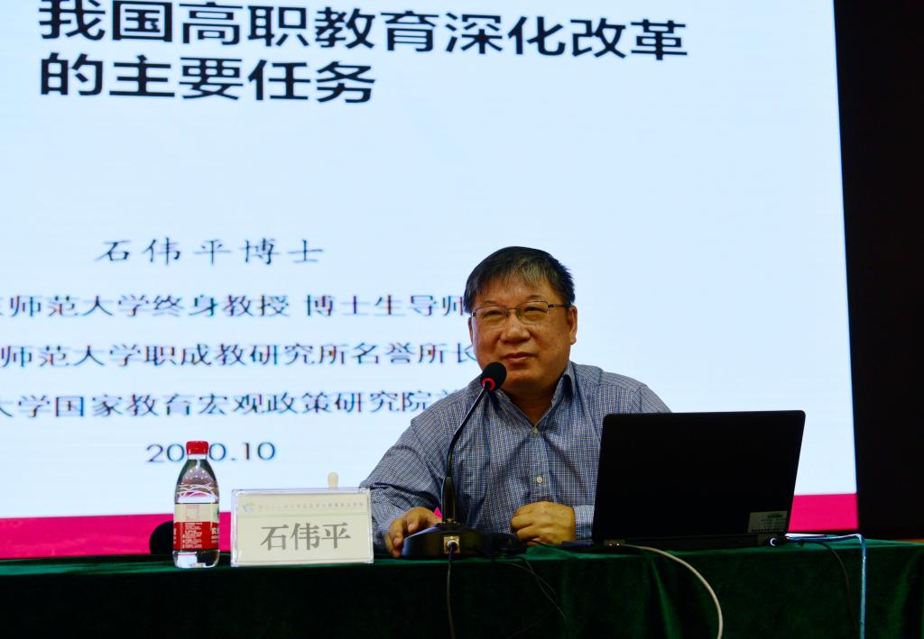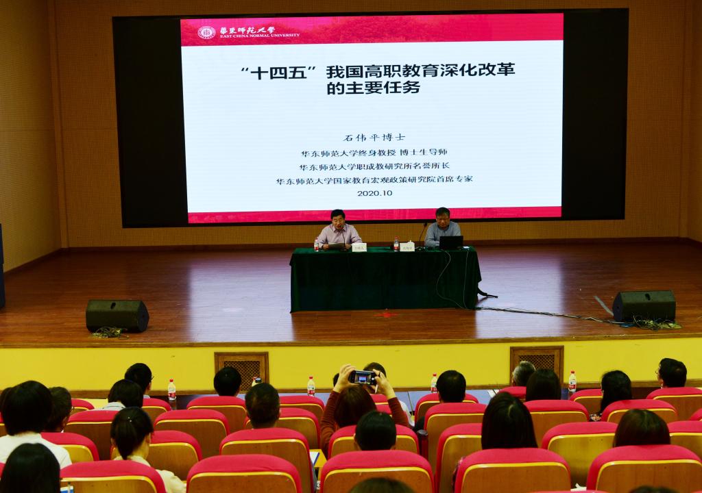 10月20日下午,我校在致远报告厅举办名师讲坛。华东师范大学长三角职业教育发展研究院院长、华东师范大学教育学部职业教育与成人教育研究所所长石伟平教授,浙江大学教育学院的方展画教授应邀分别作题为“‘十四五’我国高职教育深化改革的主要任务”“数字经济大势和职业教育‘转基因’”的报告。校党委书记姚奇富主持报告会。