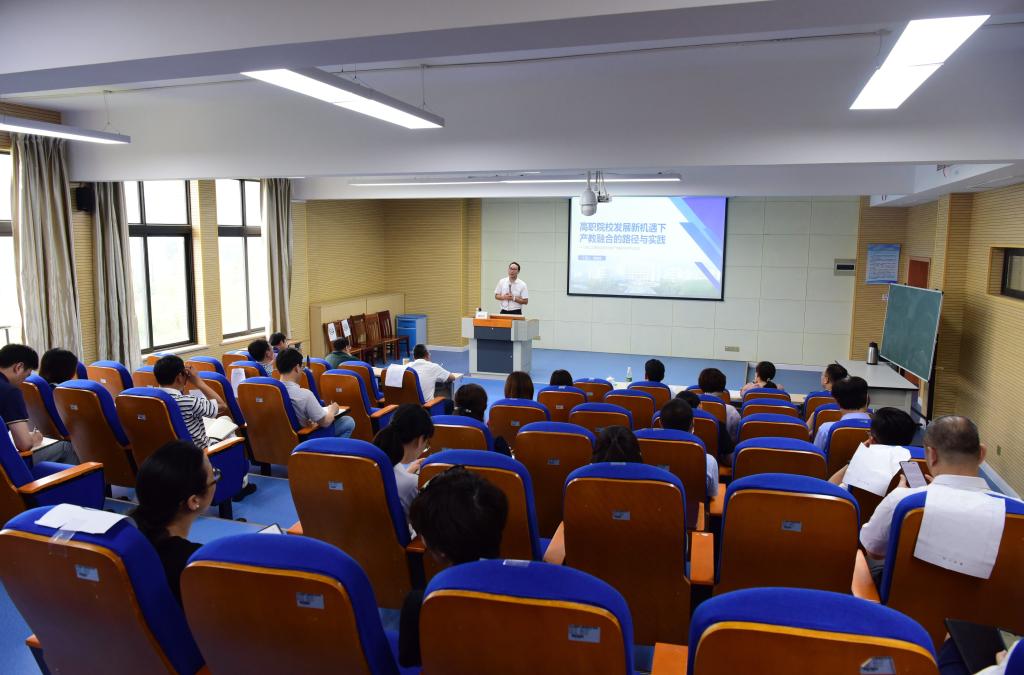 此次论坛邀请了浙江工商职业技术学院科研与社会服务处处长楼晓东教授作《高职院校发展新机遇下产教融合的路径与实践》专题讲座。楼教授结合浙江工商职业技术学院典型经验,用生动的案例重点讲解了产教融合的背景意义、探索实践和期待展望。讲座结束后,与会教职工就讲座中感兴趣的问题与楼教授进行了进一步的讨论。