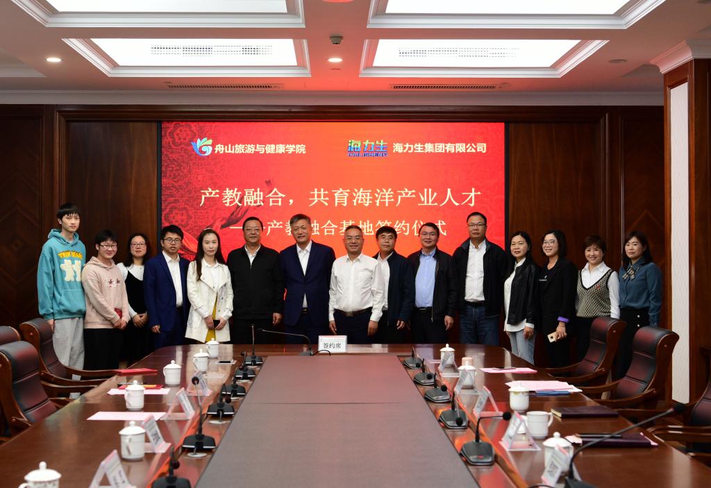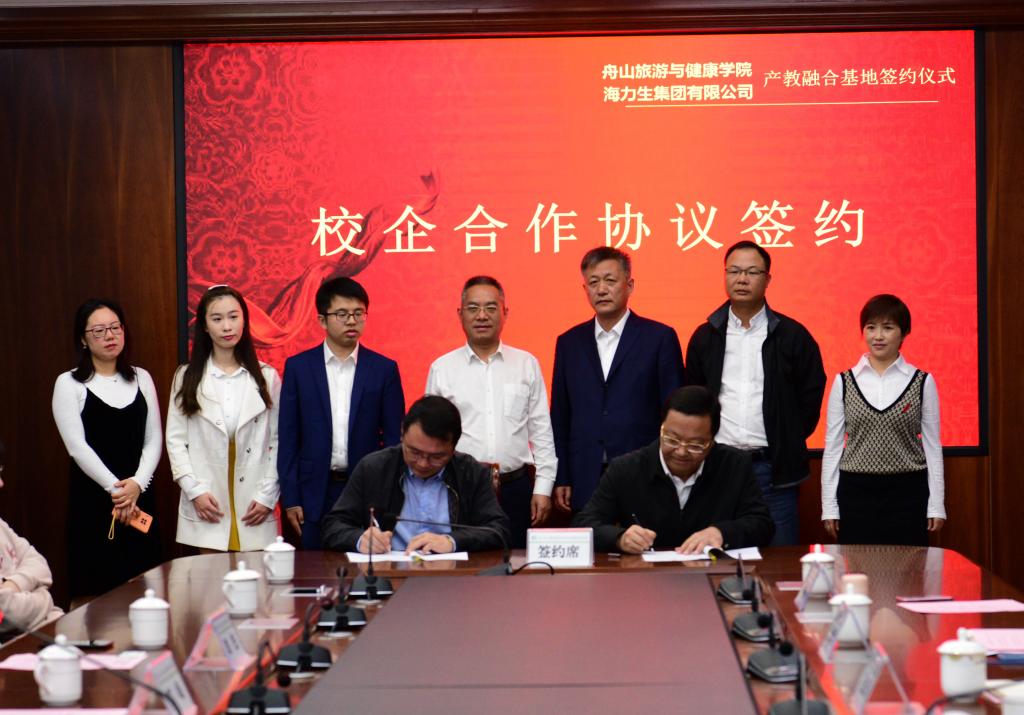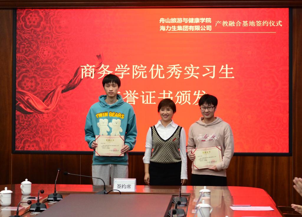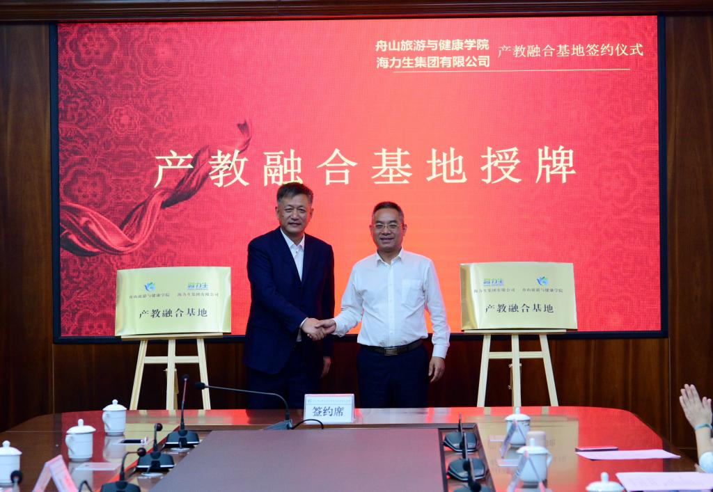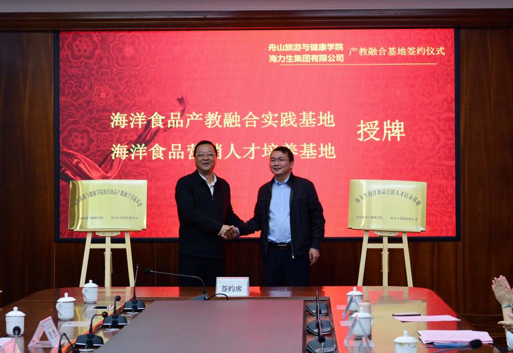 副校长、商务学院院长孔志华将“舟山旅游与健康学院海洋食品产教融合实践基地”授牌于海力生集团食品事业部;海力生集团党委副书记、副总裁郭峰将“海力生海洋食品营销人才培养基地”授牌于商务学院。