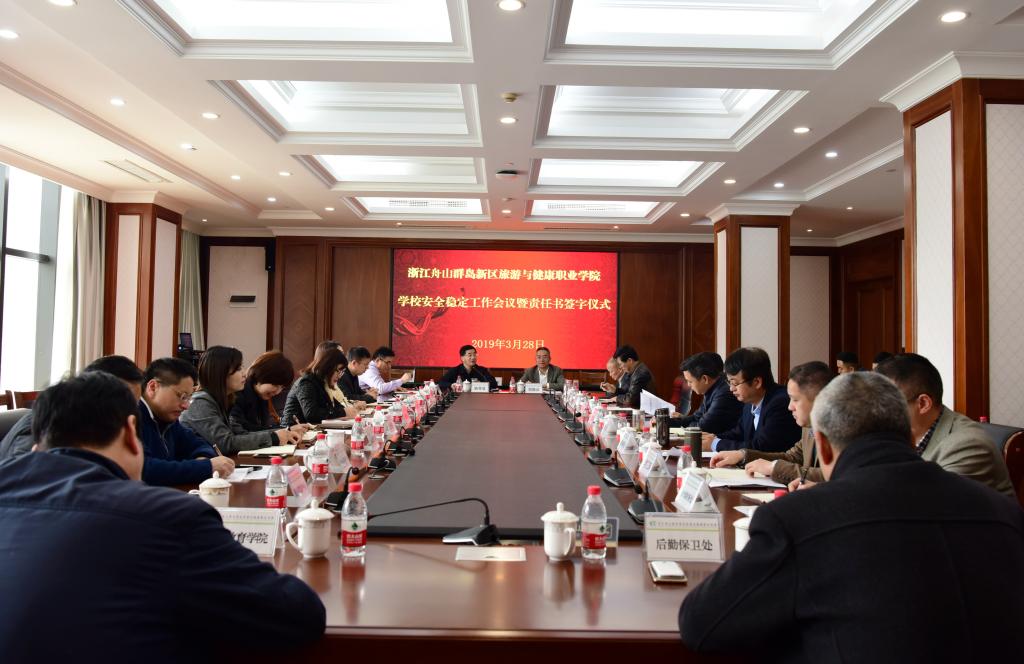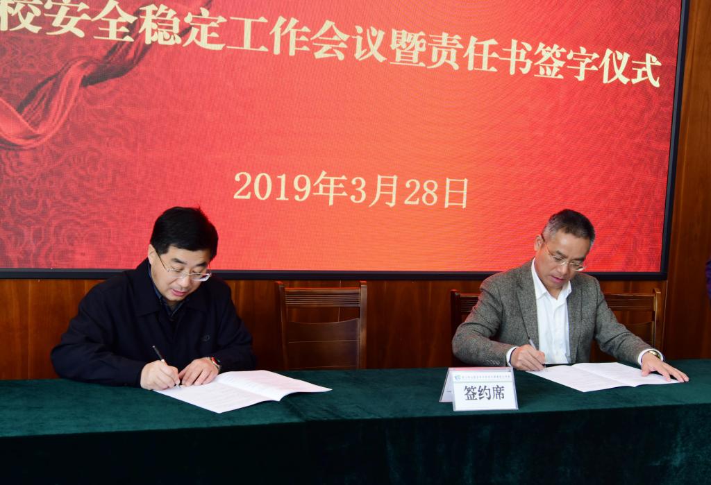 2019年3月28日,学校召开安全稳定工作会议暨安全稳定责任书签字仪式,校领导姚奇富、郑能波、王旭光、何岳成、陈爱国、俞志良出席会议,校党委书记姚奇富主持会议,校长郑能波、副校长何岳成分别作重要讲话,相关分院(系、部)、部门负责人参加会议暨签字仪式。