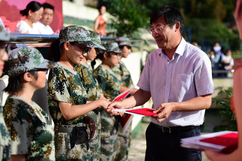 郑能波院长发表致辞。他首先代表学校对新同学表示热烈欢迎,向认真负责指导本次军训的各位教官表示衷心感谢。郑院长对2018级新生提出了三点希望:一是未曾做事,先学做人。在舟旅健,除了要学习专业知识与技能,还要不断提升自己的道德修养。对生命的敬畏,对中国的热爱,对他人的尊重,对师长的感恩,对规则的坚守,对文化的信仰,对工作的负责,期待三年之后遇见一个全新的自己,见证一个与“大学第一照”不一样的新我;二是摒弃浮躁,静心钻研。我们职业院校的学生必须弘扬和学习“工匠精神”,它可以是对一句导游词的精雕细琢,可以是对一个护理操作技术的反复钻研,也可以是对一纸账单的细心核对。要求学生远离网络游戏,不做低头族、追星族,静下心来学习学习再学习;三是志存高远,脚踏实地。希望18级新生在确立自己的目标之后,能够脚踏实地,不说空话,不忘初心,真真切切地为了自己的目标而努力奋斗。
