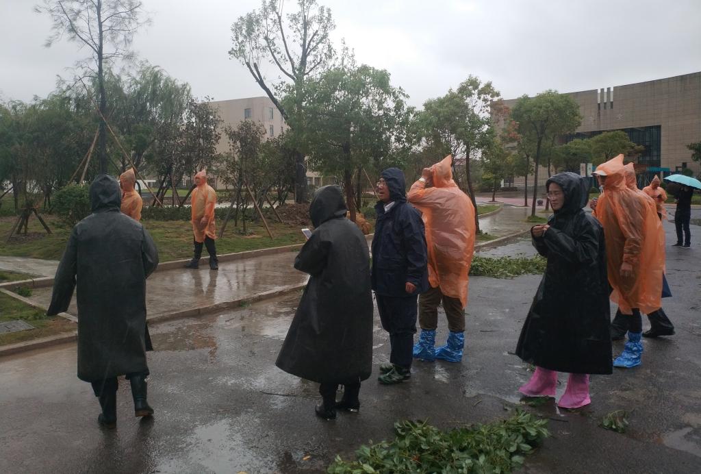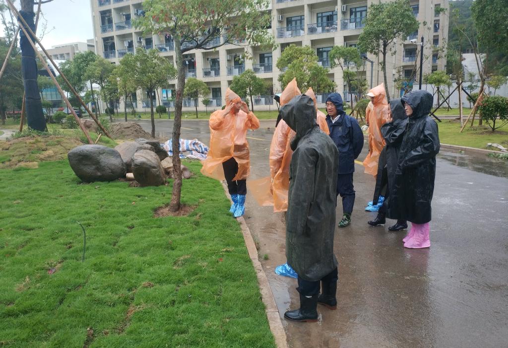 为做好今年第25号台风(康妮)防御工作和我市争创全国文明城市准备工作,2018年10月5日上午,郑能波院长带领党政办、宣传部、学生处、后勤保卫处、图书信息中心等部门负责人和物业人员,冒着风雨连续2个多小时深入学生公寓、湖区、超市、食堂、教学楼、宾馆、大门口、体艺馆等校园防台防汛和迎检“全国文明城市”的重点部位,逐一仔细检查应对准备情况。