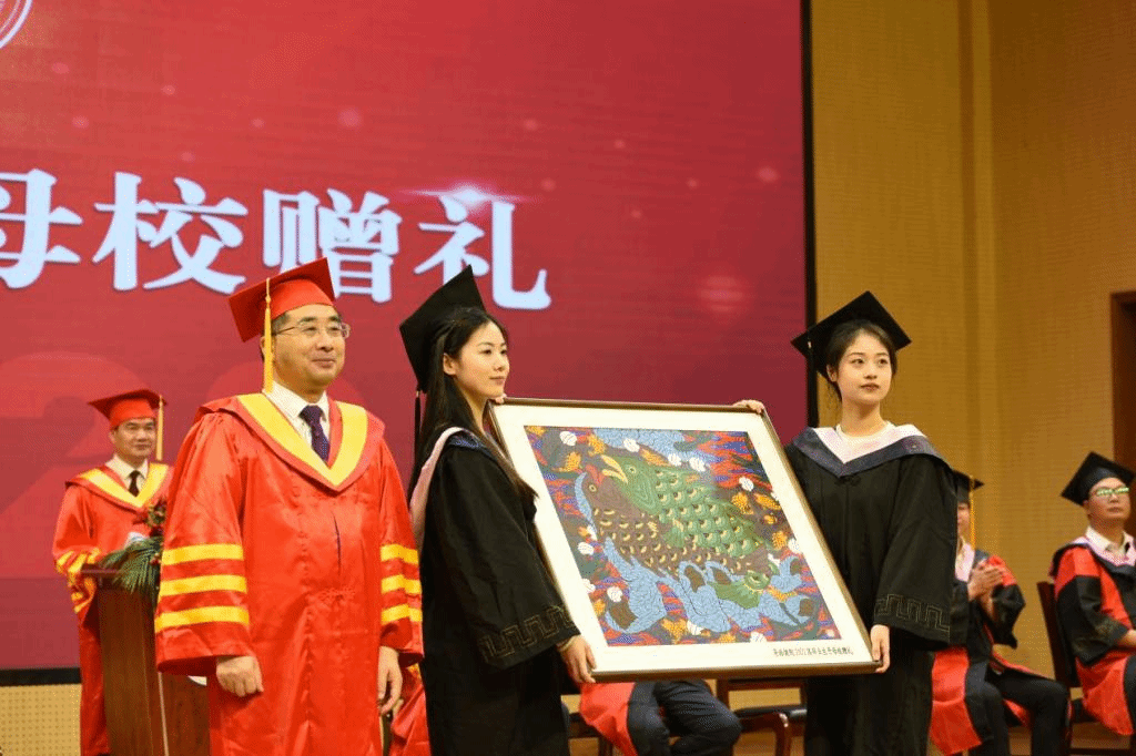 19级休闲1班高少杰同学作为毕业生代表发言,她深情回顾了在校求学期间的奋斗成长经历,表达了对母校的感恩和眷恋,表示将牢记老师们的谆谆教诲,初心不改、继往开来,为建设社会主义现代化国家新征程贡献智慧力量。发言结束后,2022届毕业生为母校送上渔民画作为赠礼,校党委书记姚奇富代表学校接受毕业生赠礼。
