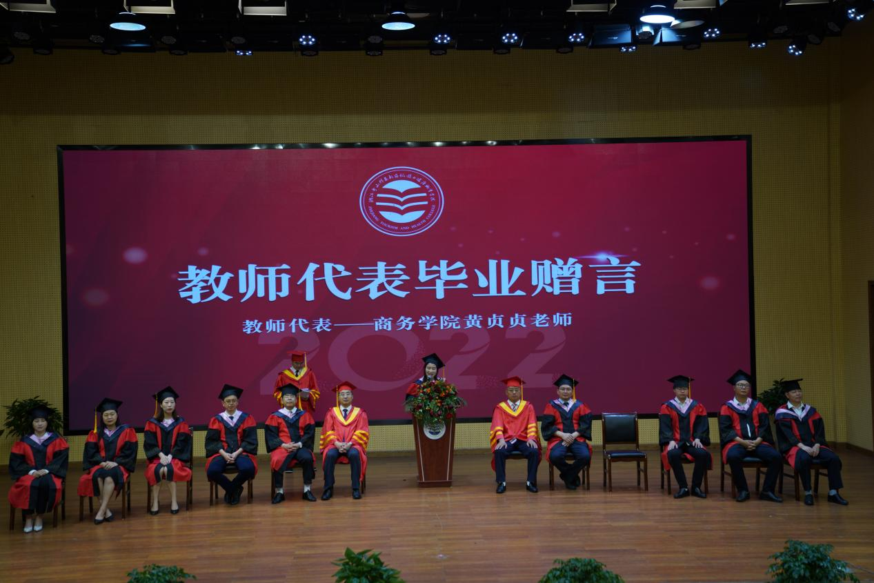 商务学院黄贞贞老师作为教师代表发言,她回顾了三年来与同学们同奋进共担当,在日常课堂、社会实践、体育赛事中一起努力奋进,充分展现了舟旅健师生的靓丽风采。她期待同学们在追梦的道路上,把人生理想融入党和人民的事业之中,不负韶华,不负时代,在青春的赛道上,争取跑出最好的成绩。