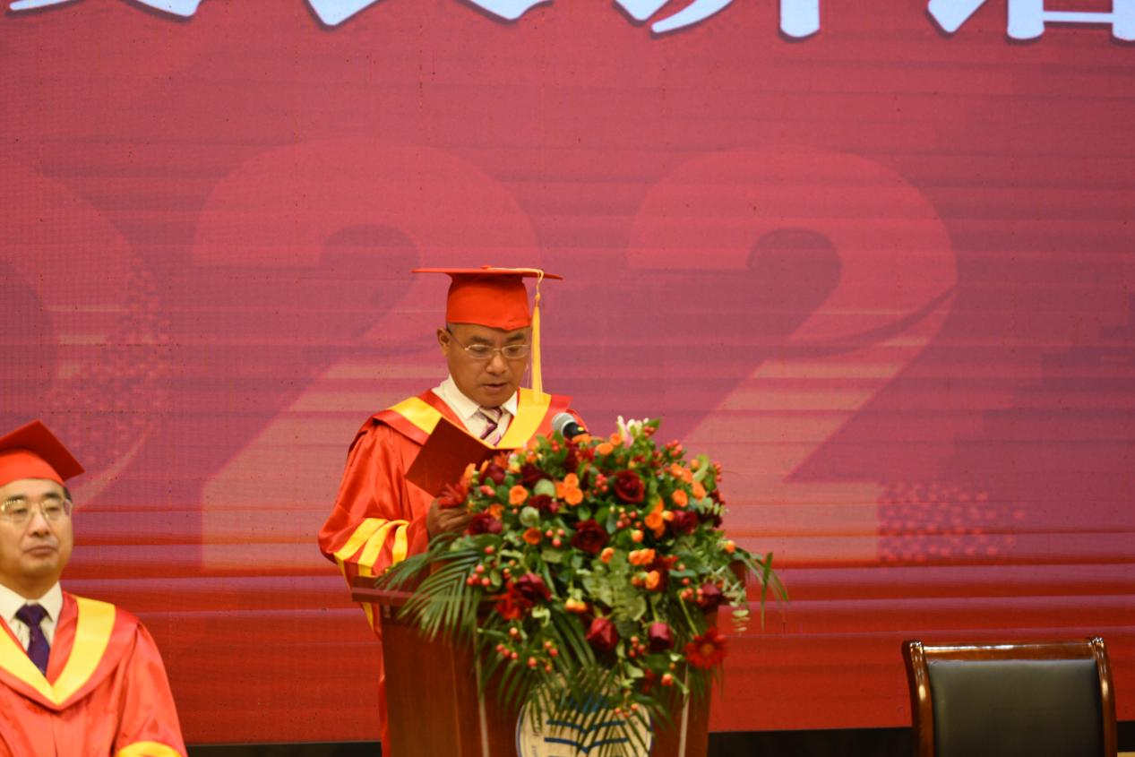 校长郑能波作了以“奋斗、创新、热爱”为主题的临别赠言,向2022届毕业生们送上最热烈的祝贺与最诚挚的祝福,向相伴同学们成长的老师和家人致以最崇高的敬意和最衷心的感谢。郑校长表示,各位同学作为历史的亲历者,用心感受了时代的脉搏,在这过程中,学校在各项工作中的发展成果,凝聚着全校师生的艰辛努力,同学们的优异成绩令人感到骄傲和自豪。他对毕业生们提出三个希望:一是以奋斗之我致青春。要牢固树立终身奋斗的理念,让脑子转起来,让双手动起来,让双腿跑起来,用正确的奋斗姿态赢得底气和实力,致敬青春和时代;二是以创新之力谋未来。要在岗位上多一点突破,在职业上多一点超前,在工作上多一点创意,跳出固有模式,多思考,多探索,在创新创造中实现人生价值;三是以热爱之名赴山海。要扎根行业,干一行、爱一行、专一行,迎难而上,永不言弃,增强做人的志气、骨气、底气。他最后愿同学们历经千帆,归来仍少年;奋发有为,一起向未来。祝所有毕业生一路阳光,一生幸福。