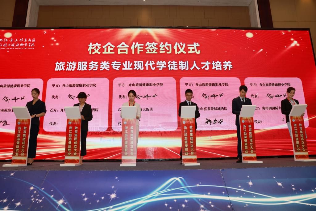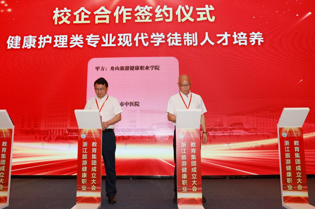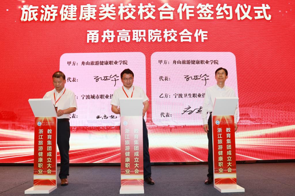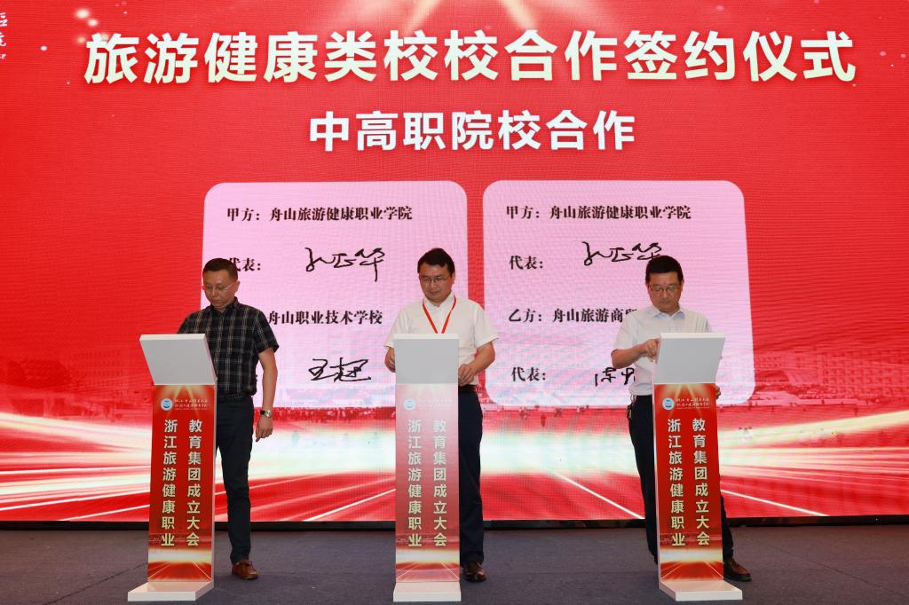 成立大会上,举行了舟山市职业教育研究中心揭牌,新区文旅产业学院和海岛康养产业学院授牌,学校与定海工业园区管委会、普陀区展茅街道办事处、普陀区大健康产业平台工作组、沈家门渔港小镇“一院一镇”校地合作签约,学校与宁波城市职业技术学院、宁波卫生职业技术学院甬舟旅游健康类高职院校合作签约,与舟山职业技术学校、舟山旅游商贸学校旅游健康类中高职院校合作签约,以实现行业内资源共享、产业间密切合作、区域内共生联动、区域间优势互补,促进教育链、人才链与产业链、创新链的有机衔接,提高职业技术教育质量、扩大学生就业创业、推进经济转型升级、培育经济发展新动能。