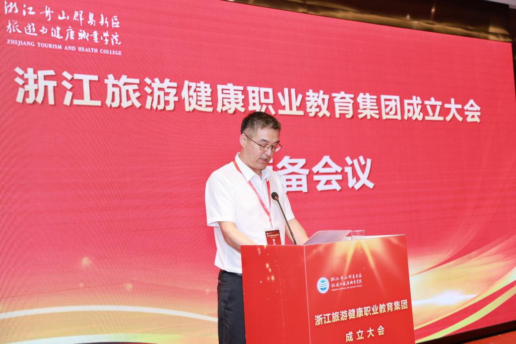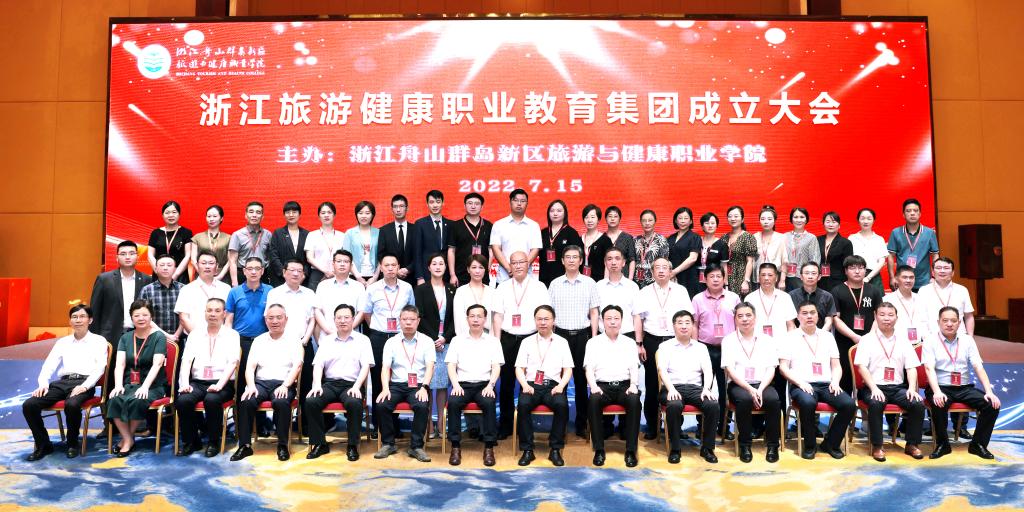 2022 年 7 月 15 日,浙江旅游健康职业教育集团成立大会在舟山海中洲国际大酒店隆重举行。舟山市政府副秘书长厉仁军,浙江省教育厅职业教育与成人教育处二级调研员祝鸿平,省文化和旅游厅科技与教育处副处长赖宋平,世界中医药学会联合会中医健康管理专业委员会副会长、浙江中医药大学党委副书记张光霁,舟山市教育局党委书记、局长陈海波,教育部示范职业教育集团、浙江旅游职业教育集团代表、浙江旅游职业学院副校长王忠林,舟山市卫生健康委员会副主任金秀国,市民政局四级调研员赵金峰,市文化和广电旅游体育局四级调研员刘君英等省市相关部门、职业院校、企事业单位、行业协会的领导和代表,以及学校党委书记姚奇富等领导班子成员出席成立大会。校长郑能波主持成立大会,副校长孔志华主持预备会议。全体中层干部参加成立大会。