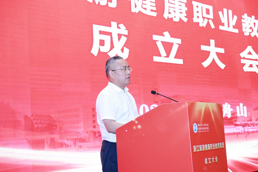 教育部示范职业教育集团、浙江旅游职业教育集团代表,浙江旅游职业学院副校长王忠林代表兄弟教育集团致贺词。王忠林表示,浙江旅游职业教育集团与浙江旅游健康职业教育集团将携手同行、精诚合作,讲信修睦、守望相助,坚守育人初心,不负时代使命,探索产教融合育人新增长极,以“浙江精神”为文化和旅游业发展注入不竭动力。