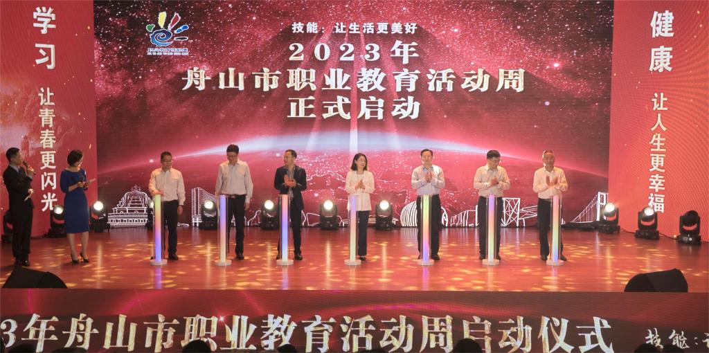 2023年5月16日上午,2023年舟山市职业教育活动周启动仪式在我校隆重举行。今年的主题仍是“技能:让生活更美好”。副市长洪碧出席会议并讲话,市政府副秘书长厉仁军,市教育局党委书记、局长陈海波,浙江国际海运职业技术学院党委书记苏为泽,我校党委书记姚奇富等领导出席仪式,校长郑能波致欢迎辞。市职业教育工作联席会议成员单位分管领导、相关处室负责人,县(区)教育局分管领导、业务处室负责人,舟山开放大学、全市各职业院校负责人,部分初高中学校负责人,部分行业企业、教师、学生代表共450多人参加仪式。