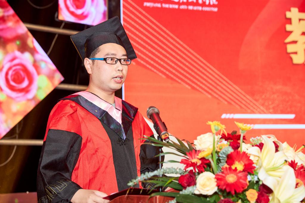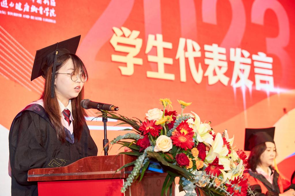 20级导游1班周明珠同学作为毕业生代表发言,她表示必将以“知行合一,止于至善”的校训作为动力,用最豪迈最稳重的步伐朝着美好的未来努力前进。健康学院林弋凯老师作为教师代表发言,祝愿全体毕业生在远行的路上,永远怀揣着纯真的心灵,一路前行,一路成长,不忘初心,砥砺前行。