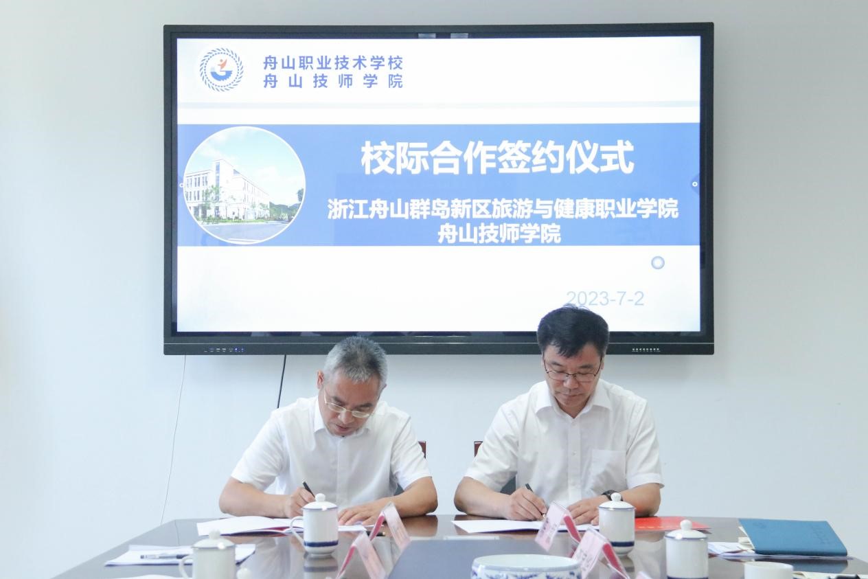 7月2日,我校与舟山技师学院举行“职技融通”合作办学签约仪式,此次签约旨在共同推动高等职业教育与中等职业教育纵向贯通,双方探索长学制、一体化人才培养,率先在酒店管理与数字化专业开展联合办学。我校校长郑能波、教务处处长邬玮玮、旅游学院、健康学院相关领导及教师出席签约仪式。