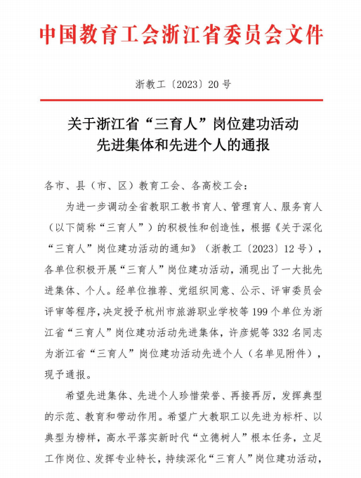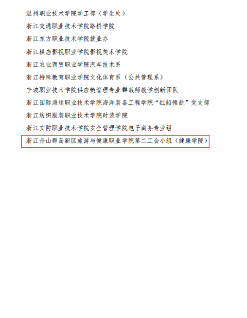在开学之际,9月1日,浙江省教育工会发布了《关于浙江省“三育人”岗位建功活动先进集体和先进个人的通报》,浙江舟山群岛新区旅游与健康职业学院第二工会小组(健康学院)荣获浙江省“三育人”岗位建功活动先进集体称号。