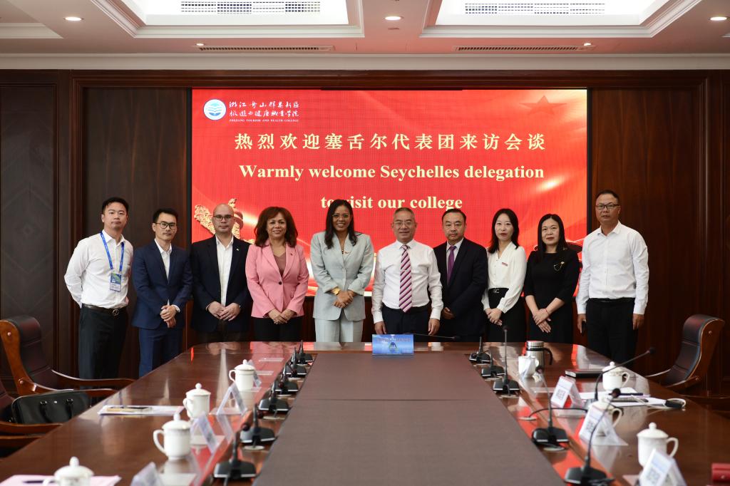 在由浙江省人民政府主办,浙江省文化和旅游厅、舟山市人民政府承办的2023国际海岛旅游大会举办之际,2023年10月12日上午,塞舌尔外交和旅游部旅游首席秘书谢林·弗朗西斯女士为团长的塞舌尔代表团一行四人来访我校,校长郑能波和学校教务处、外事办、旅游学院、健康学院负责人会见来宾。塞舌尔驻华大使安妮·拉福蒂纳女士、塞舌尔旅游局区域总监黎仁杰先生随行。