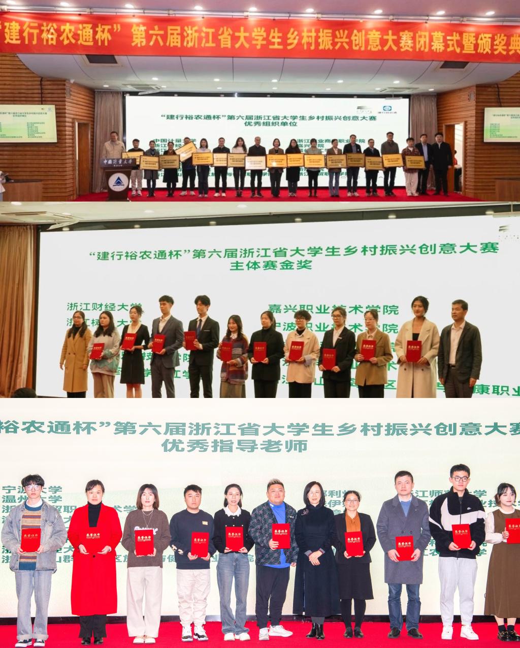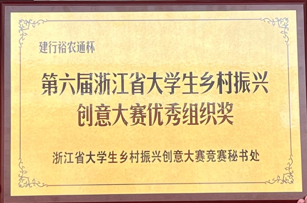 近日,“建行裕农通杯”第六届浙江省大学生乡村振兴创意大赛圆满收官,由我校旅游学院郑婷璐、夏瑶英、李远铭老师指导,潘江琳等同学完成的项目喜获主体赛金奖。自去年以来,我校已连续两年在本项赛事上斩获金奖。同时我校荣获本次赛事的优秀组织单位奖项,郑婷璐老师被授予优秀指导老师奖项。