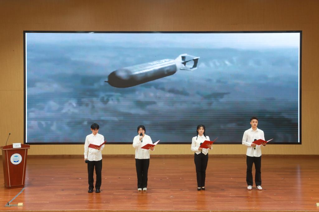 学生代表表演诗歌朗诵《青春中国》献礼大会,展现了舟旅健学子对祖国的热爱、对青年的赞颂。