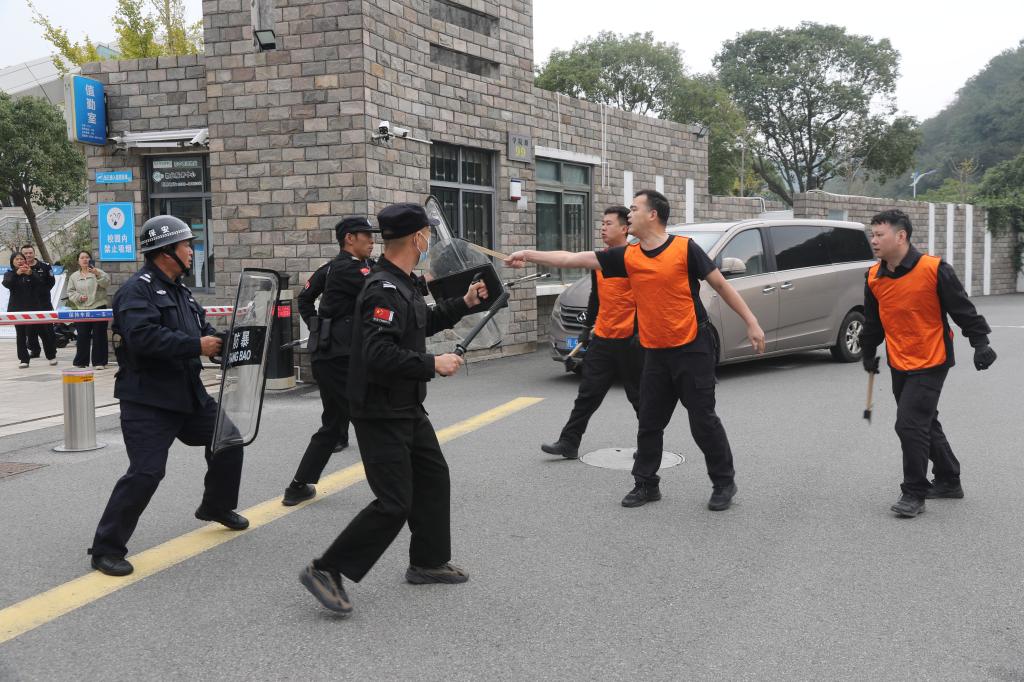 为营造安全稳定的校园环境,进一步提升校园安保队伍应对突发暴力事件的处置能力,2024年11月22日上午,学校联合普陀山公安分局开展校园防恐防爆应急演练。校长郑能波,普朱管委会副主任、普陀山公安分局局长赵盛斌观摩演练并讲话,副校长黄承和警校双方相关人员观摩或参与演练。