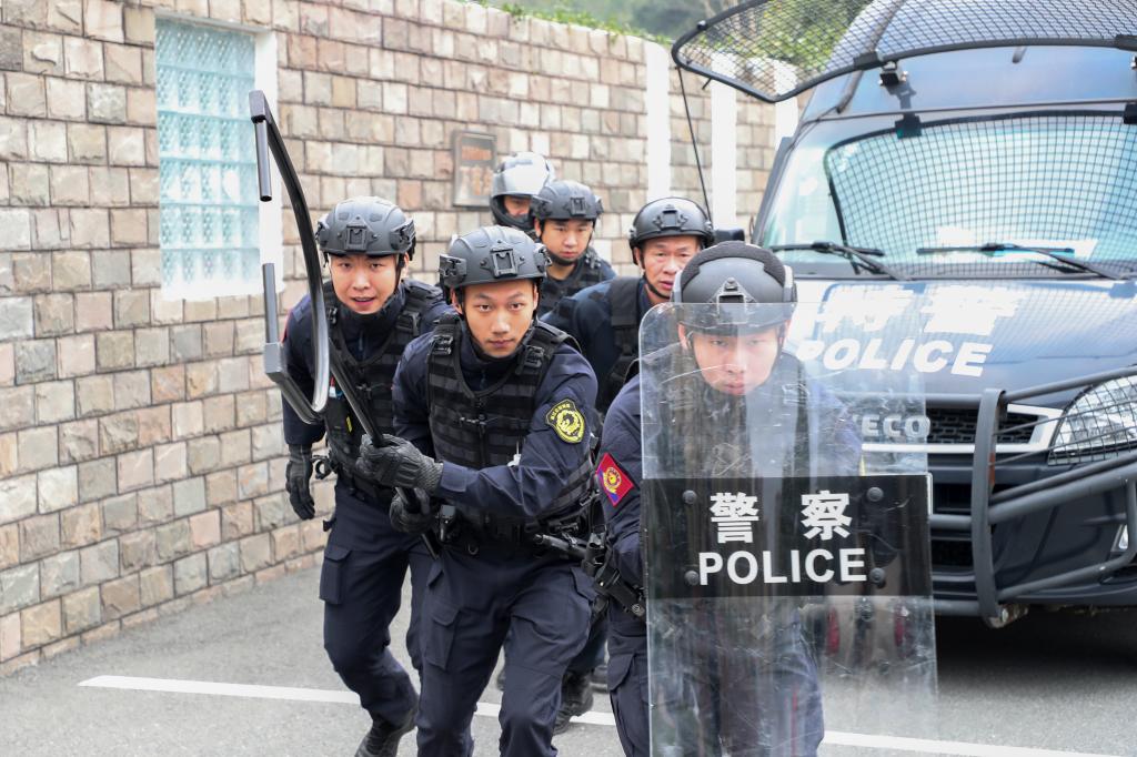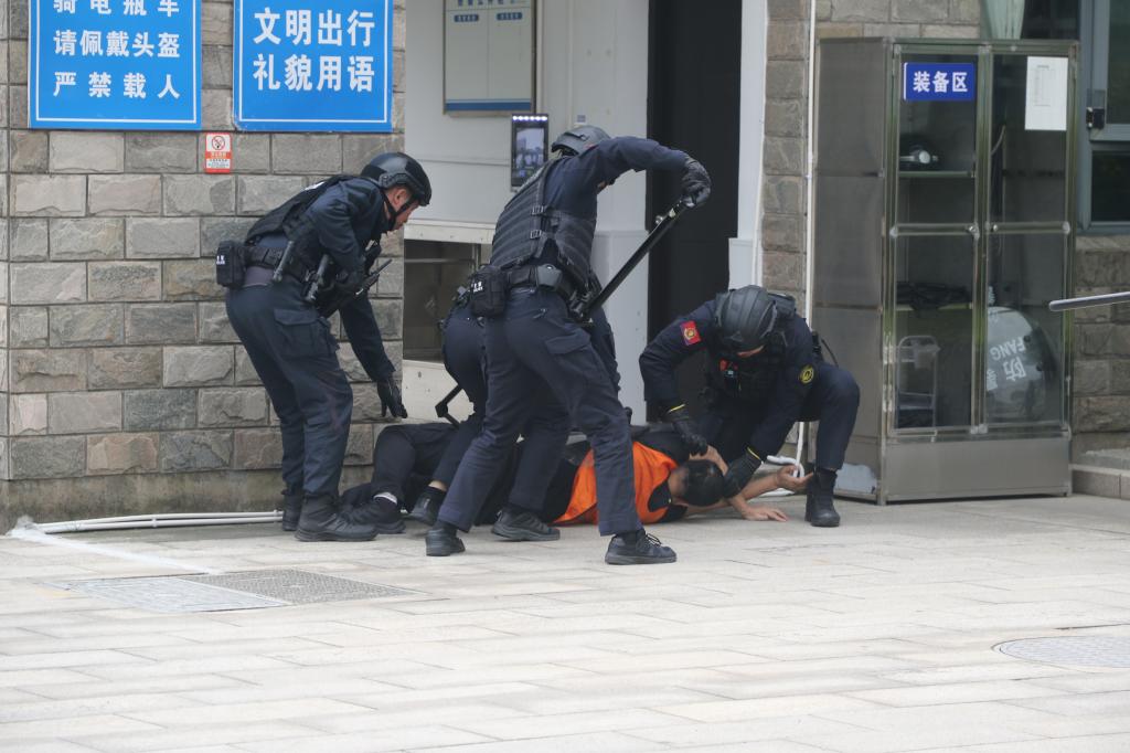 演练模拟情节为多名“暴徒”手持刀具,伺机强行闯入校园,对师生发起袭击,学校立刻启动应急预案,门卫保安人员当即触发一键报警,呼叫应急小队,并拿起钢叉、盾牌与“歹徒”展开周旋。接警后,普陀山公安分局情指中心第一时间启动“135”快反机制,快速指令朱家尖派出所、交警、巡特警等警力到校处置,同步联动120前往现场救援,成功将“暴徒”制服并带离现场。整个演练过程,各组分工明确、行动迅速、配合默契、处置得当,达到了预期效果。
