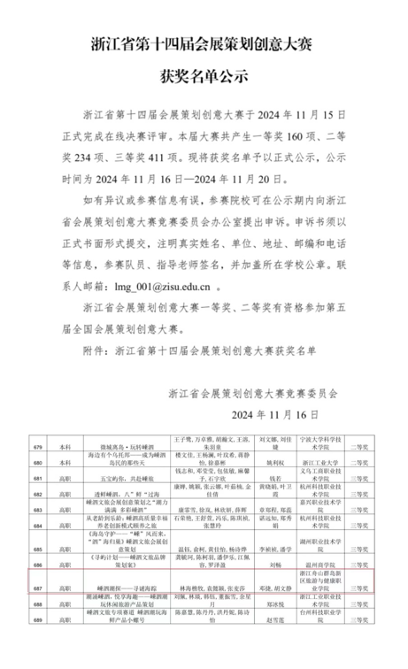 近日,浙江省第十四届会展策划创意大赛圆满落幕,旅游学院林海樵牧、袁懿颖、张麦莎三位同学组成的参赛团队,在邓捷和胡文静两位老师的指导下,表现出色,荣获大赛三等奖。