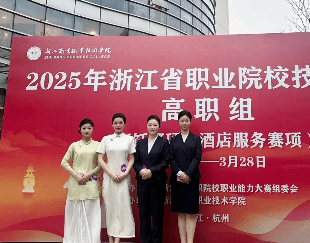 在2025年3月26-27日,浙江省职业院校技能大赛高职组旅游赛道“酒店服务组”赛项于杭州举行,经过激烈角逐,由江小恬、陈冉冉、陈思莲、雷旭盈四位同学组成的参赛团队,在李静、邵学珍两位老师的悉心指导下,荣获大赛铜奖。