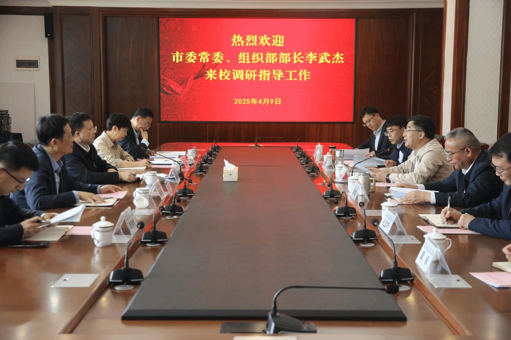 2025年4月9日,市委常委、组织部部长李武杰来校走访调研并进行座谈交流。市委组织部常务副部长於颖颖、市委编办主任徐文平和学校领导班子等陪同调研。