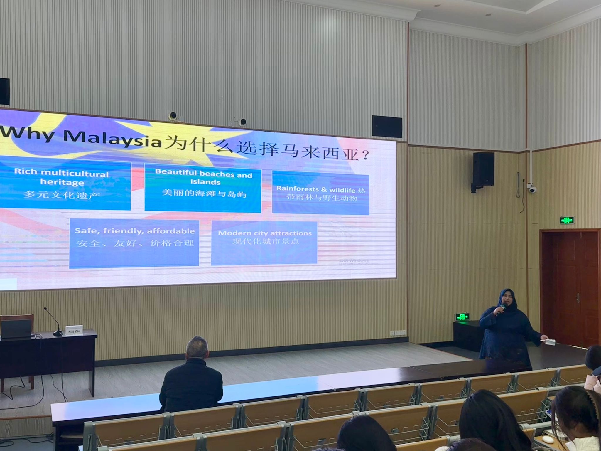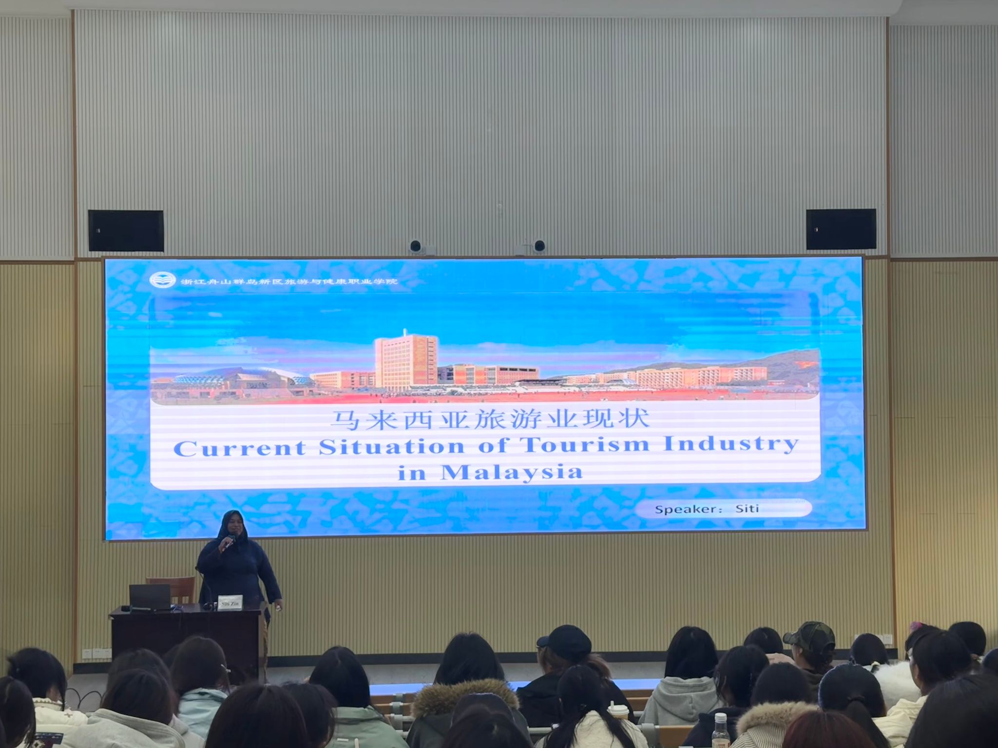 2025年12月3日,马来西亚资深旅游业专家Siti女士应邀为浙江舟山群岛新区旅游与健康职业学院百余名师生举办题为“马来西亚旅游业现状”的专题讲座。讲座于明德楼307报告厅举行,现场座无虚席,反响热烈。
