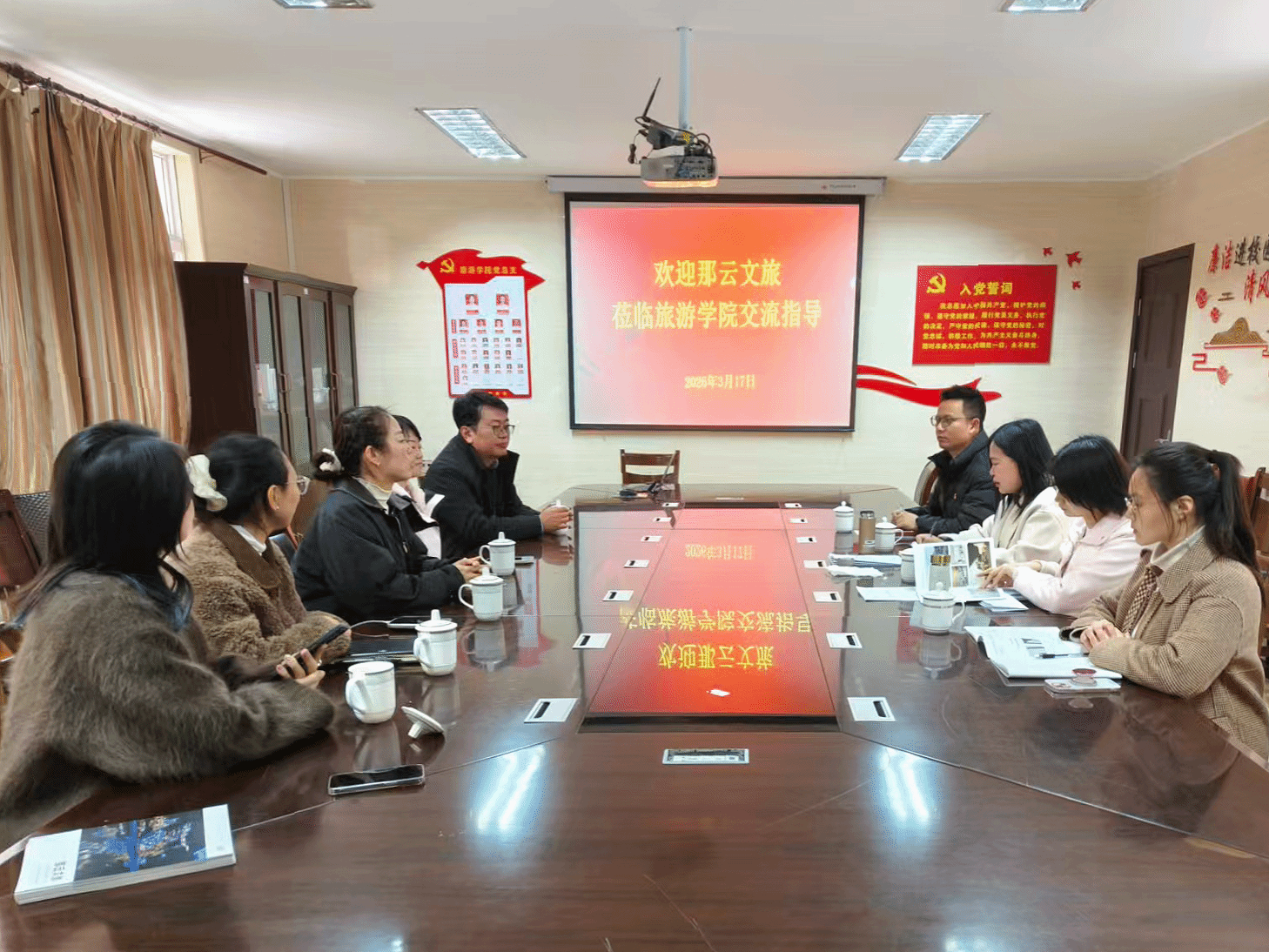 2026 年 3 月 17 日,那云文旅集团行政副总经理张苗、行政经理陈莹、人事副经理汤佳丽,那云・舟山星辰大海上的天空之城项目经理田浩、行政人事总监史芳芳一行,莅临旅游学院考察交流,重点洽谈校企合作与实习生招聘事宜。旅游学院党总支书记、院长杨奇美,副院长邓捷,综合办主任王一,实验实训管理员邵凡芸热情接待并出席座谈。