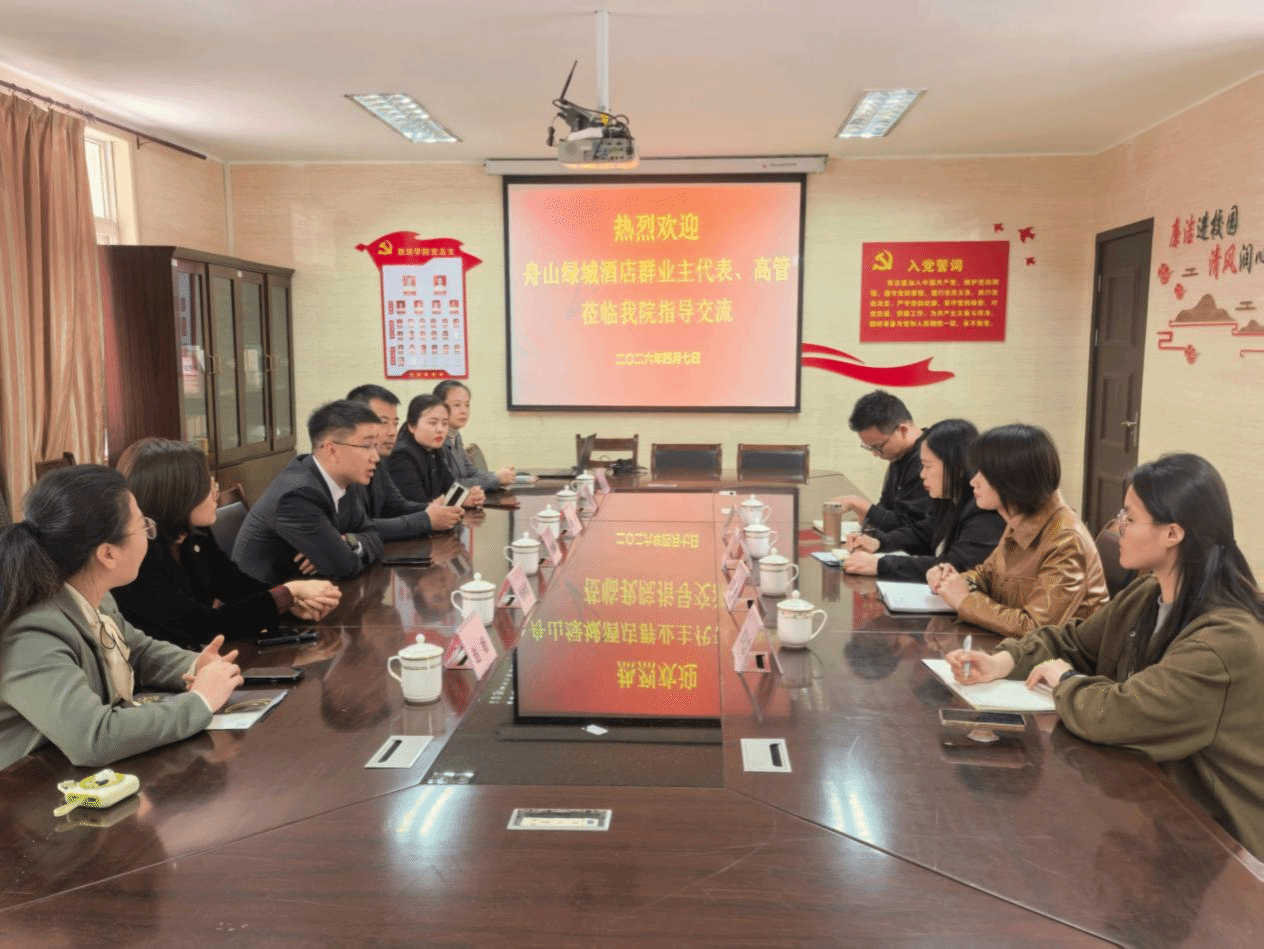 2026年4月7日,舟山绿城酒店群法人代表李峥峥带领舟山绿城玫瑰园酒店与舟山绿城玫瑰园·桃源里酒店总经理叶松、人事经理陈芳、运营总监缪应,以及舟山威斯汀酒店与舟山喜来登绿城酒店驻店经理徐林娜、人力资源总监赵杨等高管团队,前往舟山旅游与健康职业学院旅游学院,就深化校企合作、共建人才培养基地事宜开展专项洽谈。旅游学院党总支书记兼院长杨奇美、副院长邓捷、综合办主任王一以及实验实训管理员邵凡芸热情接待并出席座谈会。