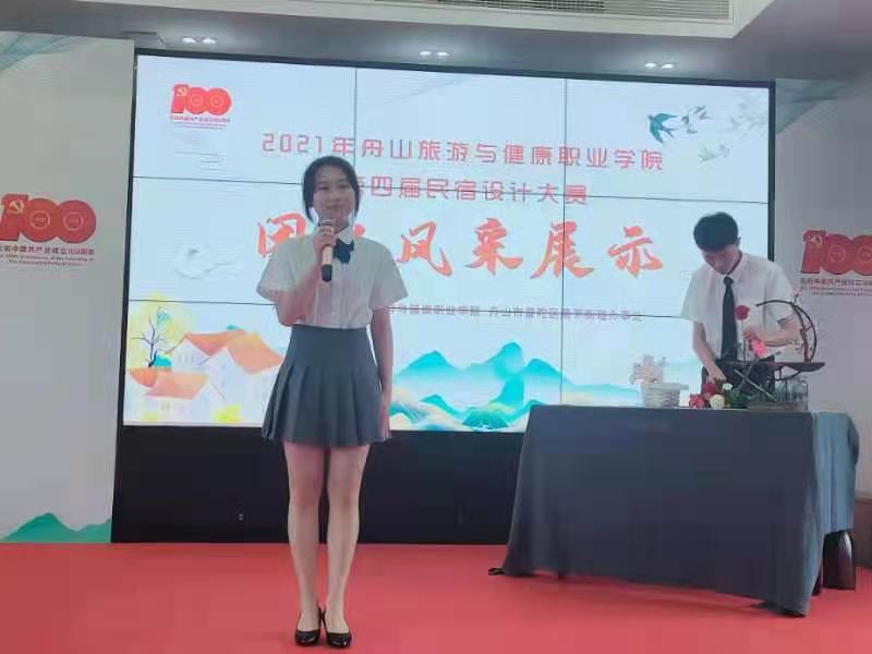 活动的第二个阶段是“百年红色领航 同心筑梦乡村”第四届民宿设计大赛。本届民宿设计大赛由浙江舟山群岛新区旅游与健康职业学院和舟山市普陀区展茅街道办事处共同主办,由浙江舟山群岛新区旅游与健康职业学院旅游学院民宿协会承办,旨在激发旅游学院学生学习民宿的专业热情,为舟山民宿行业培养更多的专业人才。比赛分为团队风采展示、项目汇报、答辩三个环节,共有8支队伍入围。与以往几届比赛相比,本届比赛在团队风采展示中多了才艺表演和技能展示的内容,使比赛更具有可看性和专业性;在项目汇报环节,涌现出了几支非常有创意的团队,很好地展示了旅游学院学生的专业技能和水平,得到了评委们和领导们的高度评价。比赛最后决出了一等奖1名,二等奖2名,三等奖3名,奖金由展茅街道提供,分别为1000元、800元和600元。