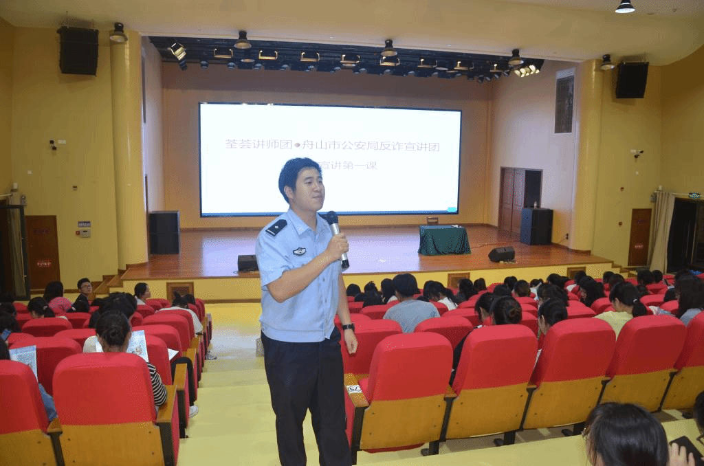 本次讲座邀请到舟山市荃荟讲师团和舟山市公安局反诈宣讲团共同开展,主讲人为舟山市公安局反诈宣讲团王警官。王警官从什么是电信诈骗,电信诈骗的主要形式、怎样预防电信诈骗等方面入手,运用了大量详实的数据、生动的案例,为同学们上了精彩的一课。讲座过程中,王警官通过台上台下互动、趣味问答等方式,让同学们进一步了解电信网络诈骗相关知识,加深印象。
