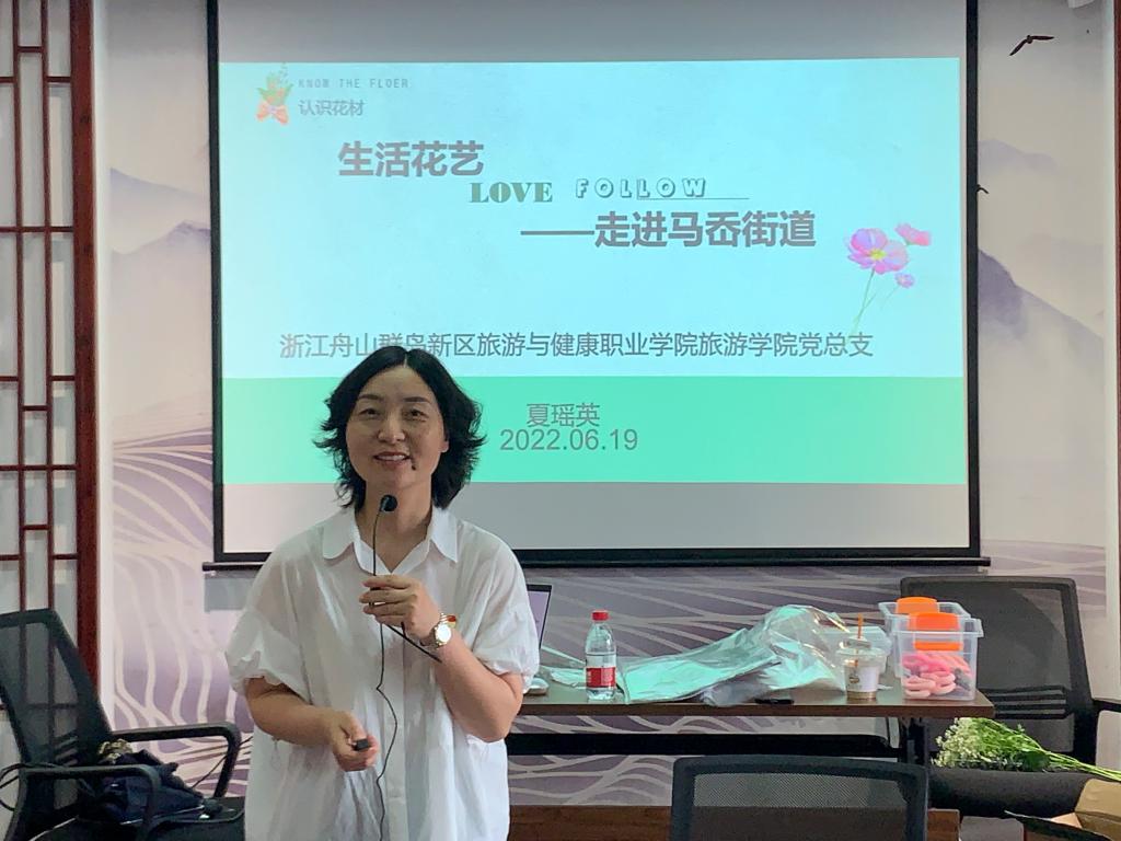 2022年6月19日,旅游学院党总支副书记郑婷璐、专任教师夏瑶英老师带领学生志愿者们走进马岙街道,为当地乡民们开展了花艺培训活动。