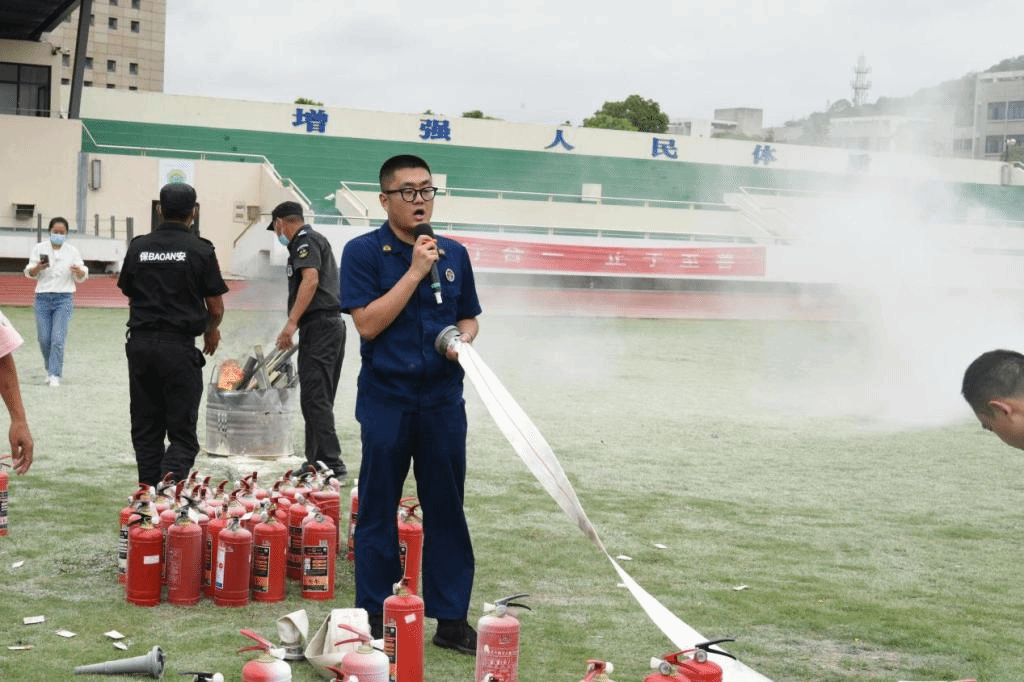 疏散到田径场后,参加演练的全体人员集合到田径空地上进行消防灭火演练。首先由消防员为师生讲解了灭火器的使用方法和消火栓水带连接方法及注意事项。在他的指导下,大家依次拿起灭火器,对模拟火场有序地进行了灭火实操演练,培训人员基本掌握了消防器材的正确使用方法。