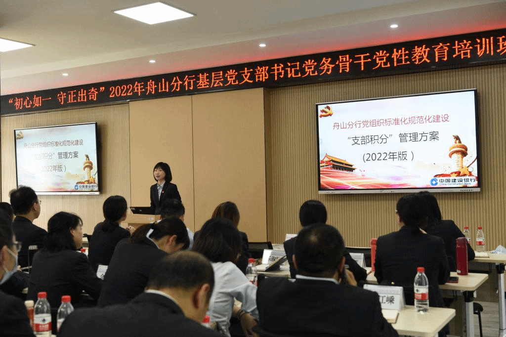 建设银行舟山分行章雯虹、周渭、俞贤玲分别进行了行内党组织标准化规范建设“支部积分”管理方案解读,组织人事条线政策宣导和网点数字化绩效考核平台应用培训。