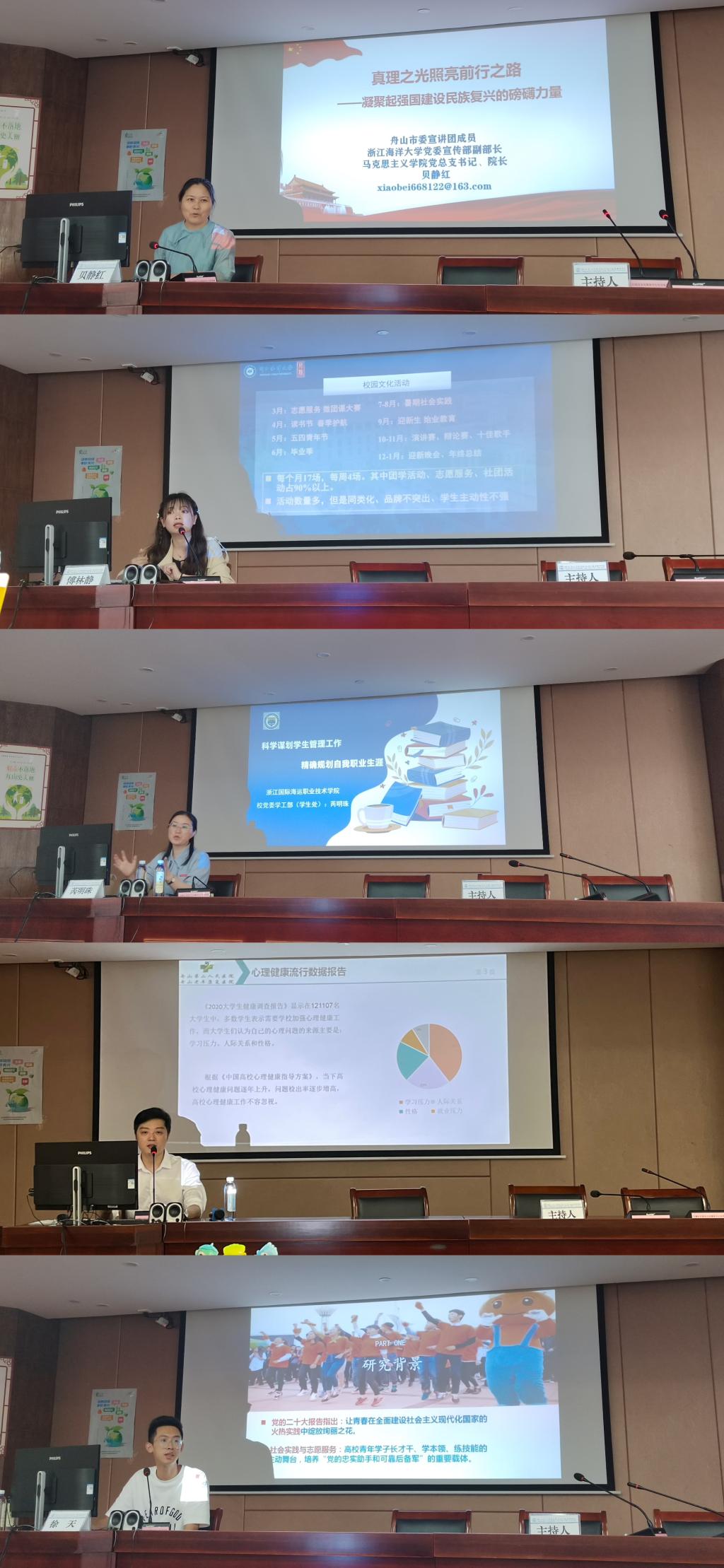 本次培训重点围绕党的二十大精神学习、学生管理工作谋划与职业生涯发展、学生活动设计与策划、大学生常见心理障碍识别、社会实践与志愿服务思考等内容展开,并安排学工论坛。浙江海洋大学马克思主义学院党总支书记贝静红、浙江国际海运职业技术学院学工部部长芮明珠、浙江海洋大学师范学院学工办主任傅林静、舟山市第二人民医院临床心理科心理治疗师孙舰洲、衢州职业技术学院校团委书记徐天分别做了主题报告。