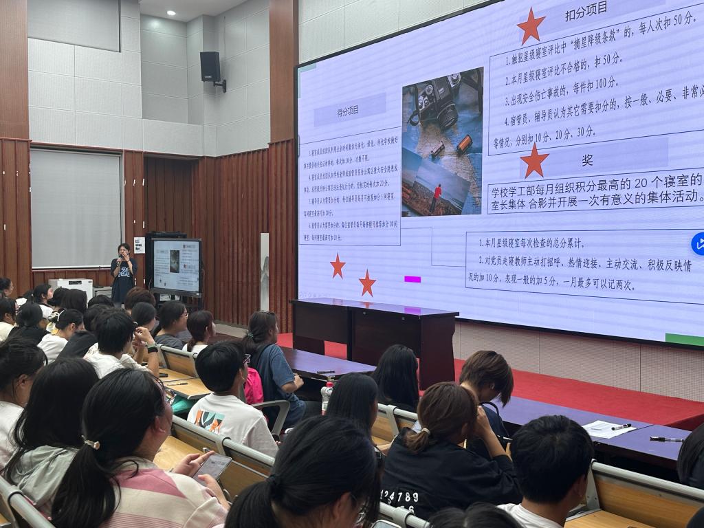 宿管会会长陈思妙同学讲述了什么是星级文明寝室、怎样评比星级的问题,并指出在寝室文明、就寝、卫生、纪律等问题上,寝室长应充分担起责任,起带头作用。