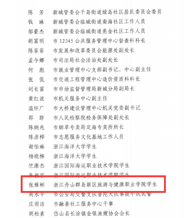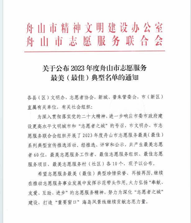 近日,2023年度舟山市志愿服务最美(最佳)典型评选活动出炉。我校青年志愿者协会获评“最佳志愿服务组织”,旅游学院张雅彬同学获评“最美志愿者”。