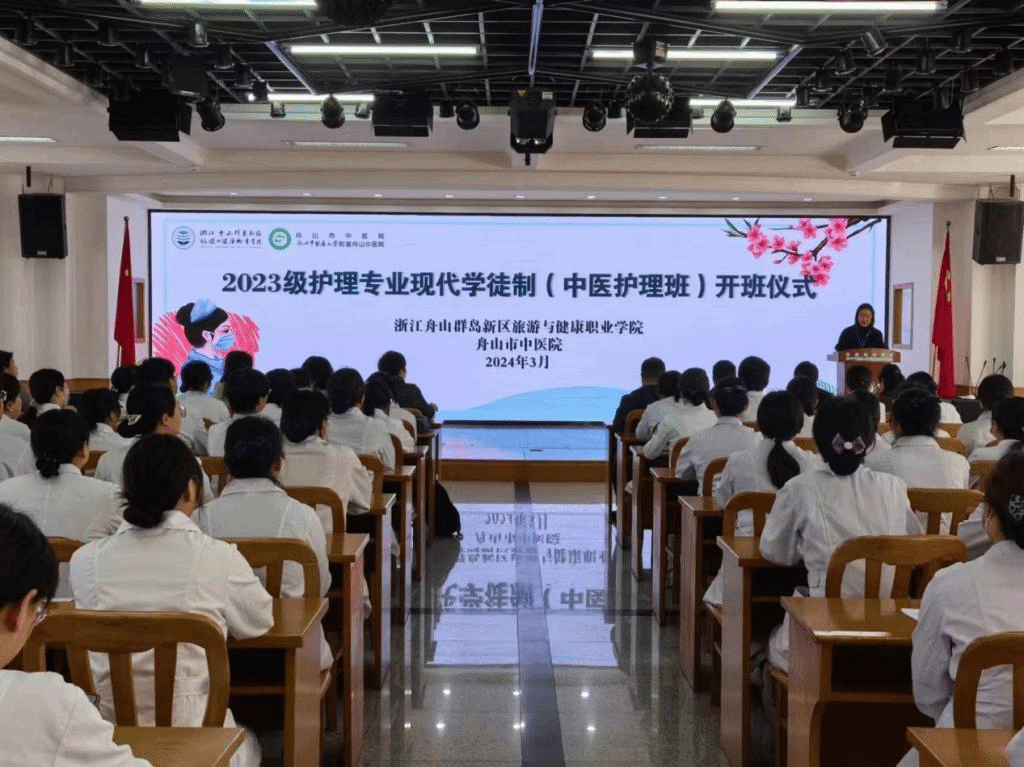 3月20日下午,我校与舟山市中医院合作举办的2023级护理(中医)专业现代学徒制班开班仪式在舟山市中医院学术报告厅隆重举行,舟山市中医院副院长李清平、俞益君及相关处(科)室负责人,我校健康学院党总支书记胡炳波、副院长马怡婷、党总支副书记王珊珊及护理教研室部分教师、辅导员,全体导师和学生参加仪式。市中医院科教科主任谢琼主持开班仪式。