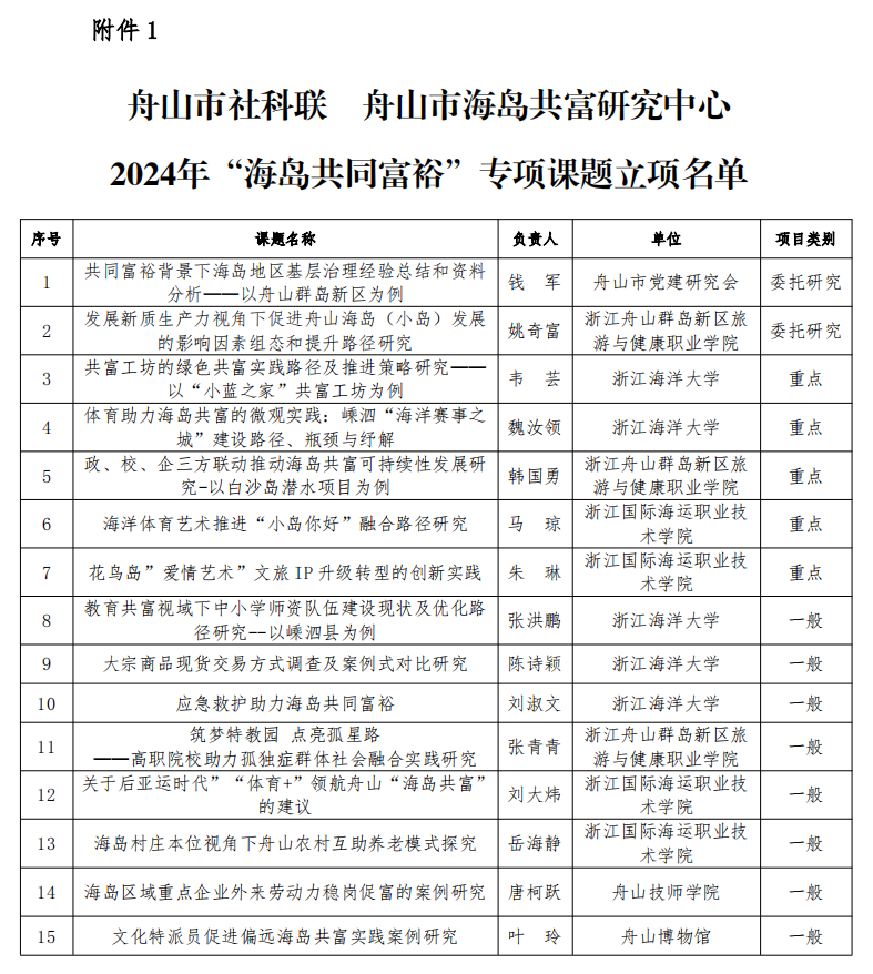 近日,舟山市社科联、舟山市海岛共富研究中心公布了2024年“海岛共同富裕”专项课题立项名单,我校姚奇富教授的《发展新质生产力视角下促进舟山海岛(小岛)发展的影响因素组态和提升路径研究》获委托研究课题立项,韩国勇副教授的《政校企三方联动推动海岛共富可持续性发展研究-以白沙岛潜水项目为例》获重点课题立项,张青青副教授的《筑梦特教园 点亮孤星路—高职院校助力孤独症群体社会融合实践研究》获一般课题立项。