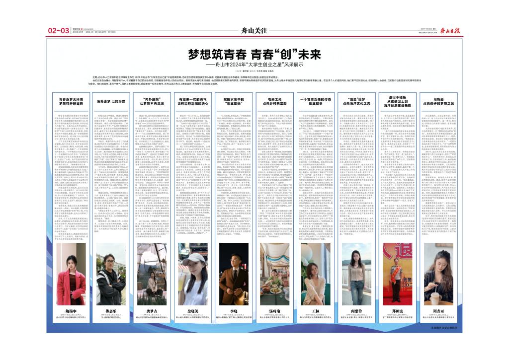 近日,舟山市2024年“大学生创新之星”评选活动落下帷幕。我校2022届校友鲍楊寧获评“大学生创业之星”,是本届十位“大学生创业之星”中最年轻的一位。
