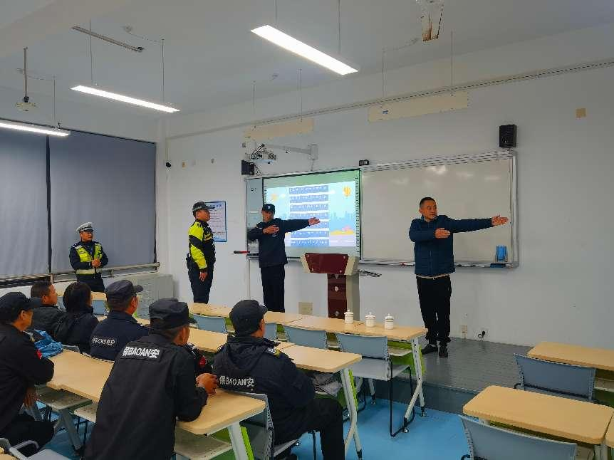 陈警官重点讲解了交通法规、交通标志的识别方法以及日常生活中常见的交通安全问题。通过生动的案例分析,大家深刻理解了遵守交通规则的重要性。也提升了安保人员对交通安的重要性,掌握了基本的交通安全和技能。培训还设置了实地模拟演练环节。在交警的指导下,进行了过马路、乘坐公交车等情景模拟,亲身体验了正确交通行为的重要性。