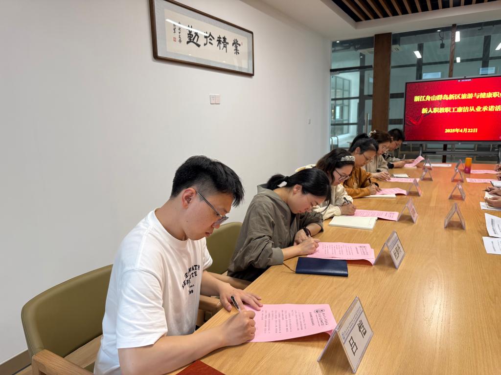 会议集体学习了《新时代高校教师职业行为十项准则》,提醒青年教职工守纪律、讲规矩、知敬畏、守底线,让大家进一步坚定理想信念,明确行为规范。8名新入职教职工庄重签订《廉洁从业承诺书》,承诺将秉承“知行合一,止于至善”的校训,永葆舟旅健人清正廉洁的本色,做到爱岗敬业、廉洁从业。新教职工代表严晨瑜作表态发言。