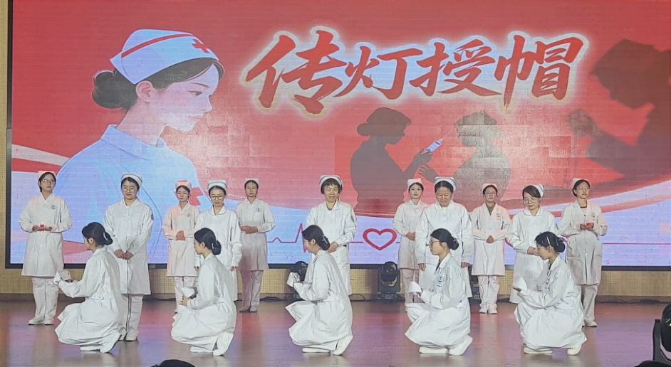 晚会最庄重的环节当属《授帽仪式》。在红色背景屏上南丁格尔肖像的见证下,护理学子单膝跪地,由前辈为其佩戴象征职业精神的护士帽。这一仪式不仅是护理精神的薪火相传,更是两代人对使命的郑重承诺。正如主持词所言:“此帽非冠,乃心灯一盏;此礼非俗,乃使命在肩。”