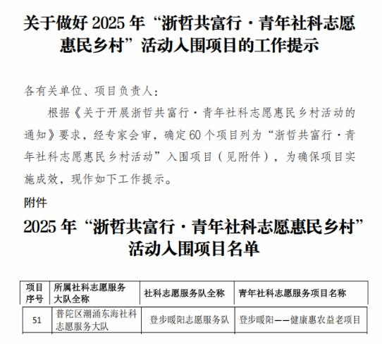 6月25日,浙江省社科联、团省委联合发布的“浙哲共富行·青年社科志愿惠民乡村”立项名单刚刚“放榜”,我校“登步暖阳——健康惠农益老项目”作为入围项目获批立项。该项目是健康学院与普陀区社科联共同打造的品牌项目,以“健康惠农、服务益老”为核心,通过组织大学生志愿者深入乡村基层,将专业知识转化为惠民服务,助力乡村振兴、共同富裕。