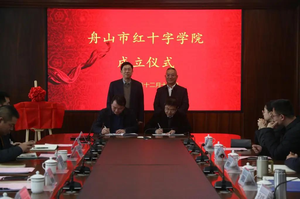 12月18日,舟山市红十字学院在浙江舟山群岛新区旅游与健康职业学院正式成立,浙江舟山群岛新区旅游与健康职业学院校长郑能波和市红十字会党组书记、常务副会长徐俊军共同为“舟山市红十字学院”揭牌,并为红十字学院应急救护讲师团颁发聘书。